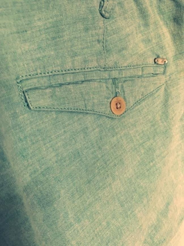 Confeccionada em tecido verde composto de 52% algodão e 48% linho. Zíper e botão com o logo, dois bolsos faca na frente, dois bolsos atrás, passantes, plaquinha de osso com o R sobre o bolso traseiro. Tamanho 44 na etiqueta. Medidas aproximadas: comprimento = 51 cm mais 4 de bainha; cavalo = 29 cm; cintura = 90 cm; quadril = 110 cm. Aparência ótima.