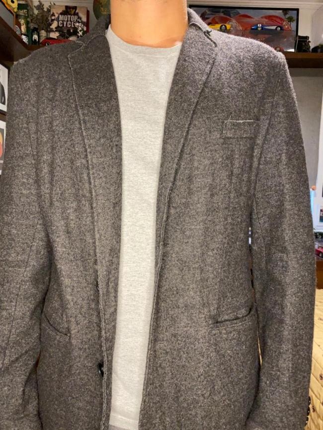 Cinza mesclado, botões nos punhos, sem etiqueta de composição, mas com certeza é malha com lã. Dois bolsos com lapela e um embutido. Tamanho EUR=XL, EU=XL. Medidas aproximadas: comprimento = 80 cm, ombro = 50 cm, cintura = 104 cm.