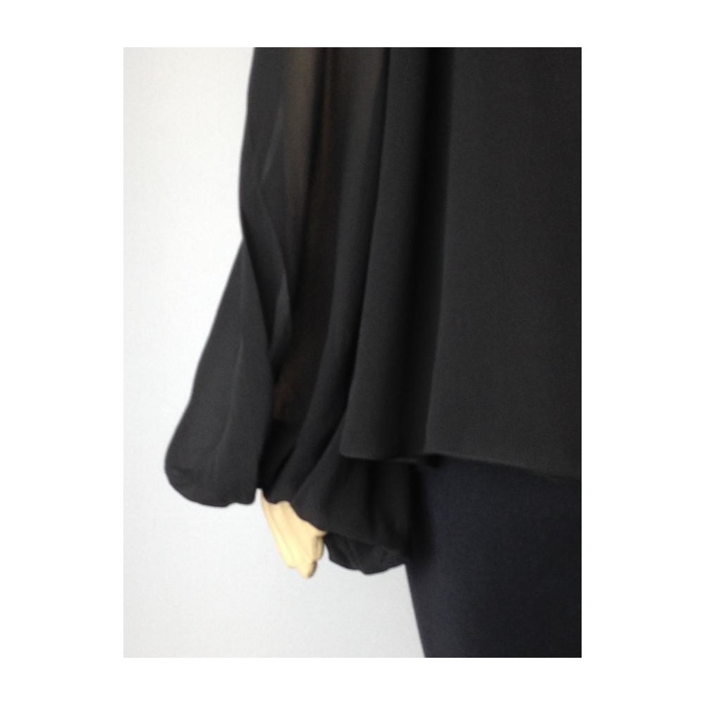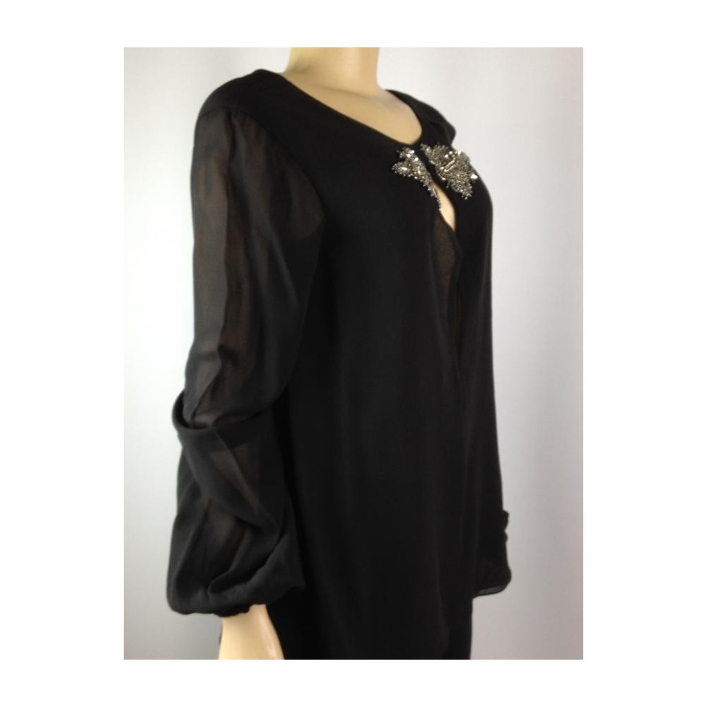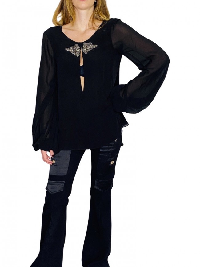 Confeccionada em 100% seda, forrada em 100% poliéster, botões nos punhos e com a etiqueta de nova. Bordado com canutilhos e cristais. Mangas transparentes e franzidas. Medidas aproximadas: comprimento = 65 cm; quadril = 120 cm; cintura = 110 cm; busto = 102 cm.
