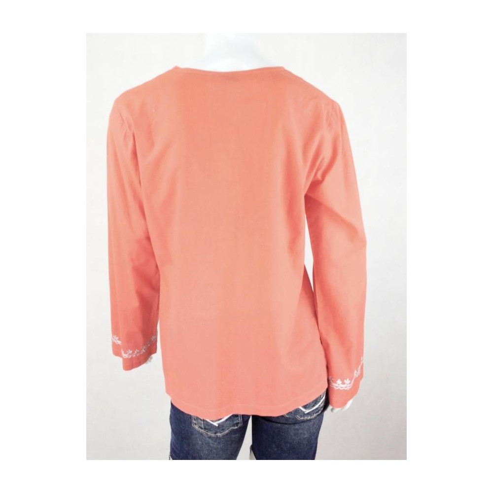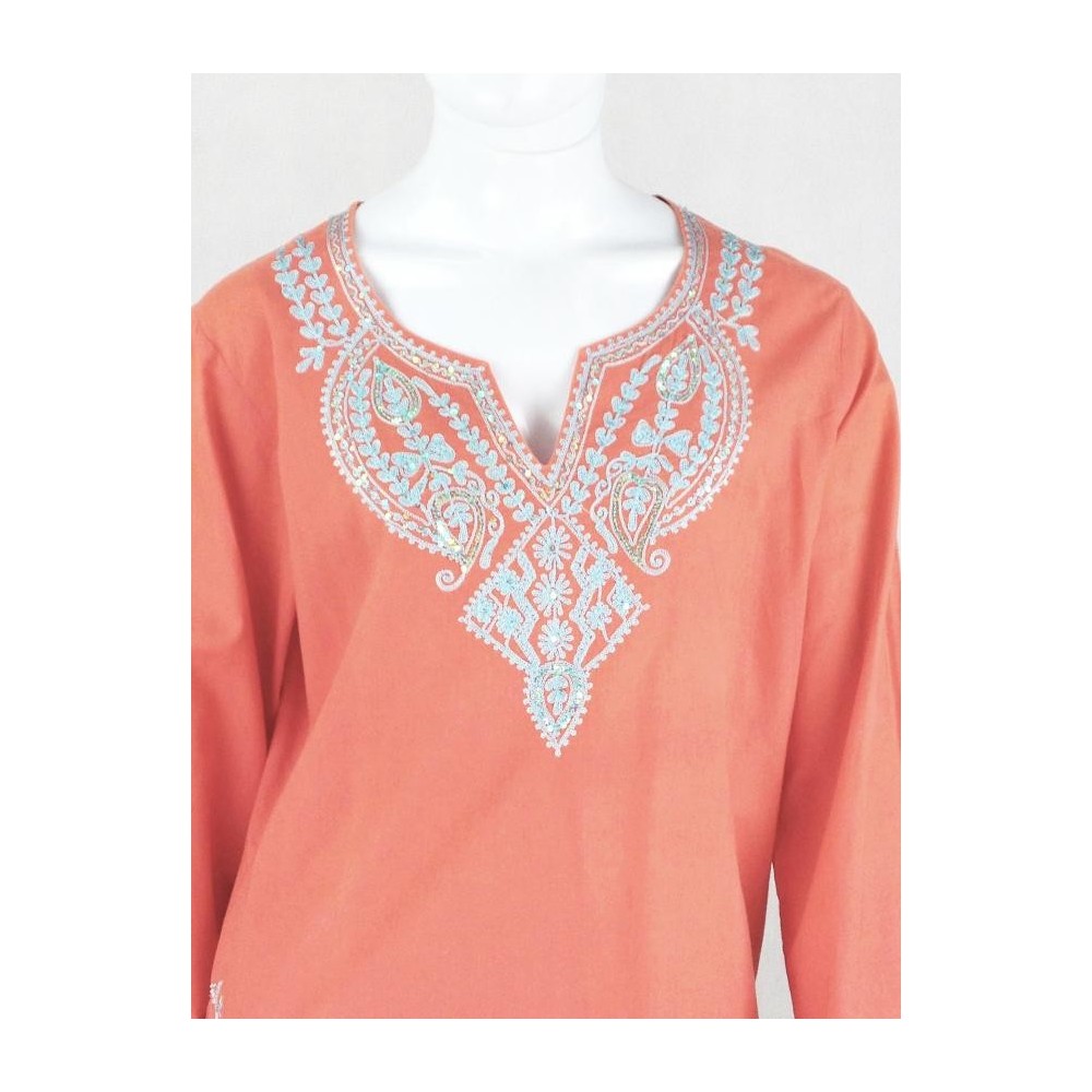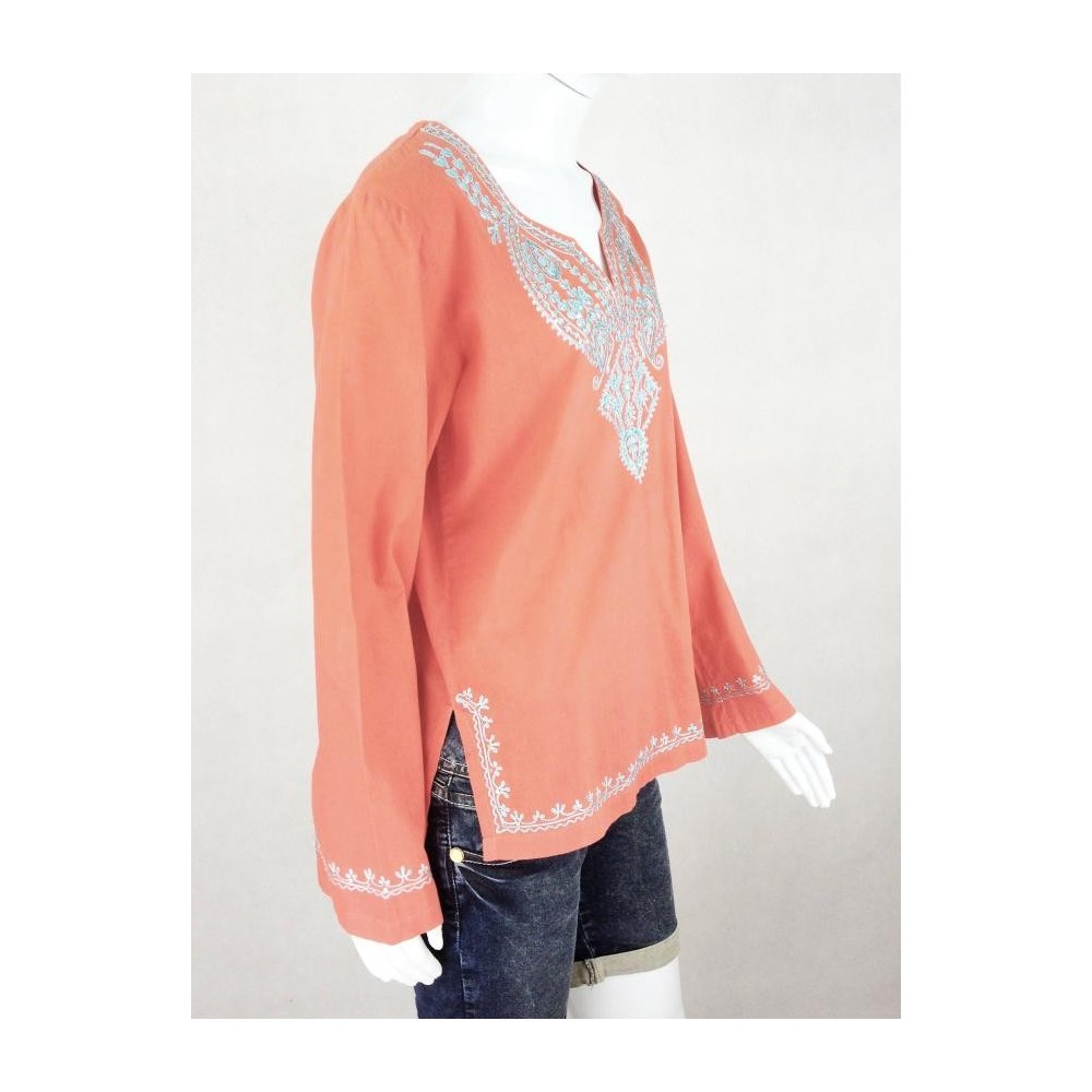 Blusa tipo bata bordada com linha azul e paetês. Abertura nas laterais. Aparência de nova.