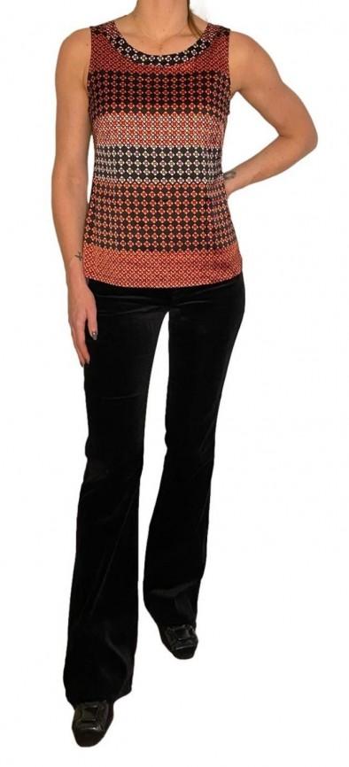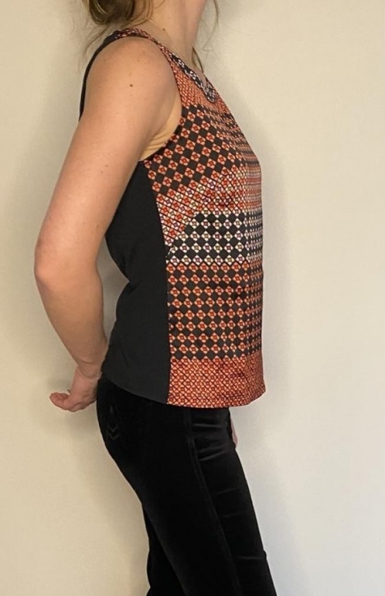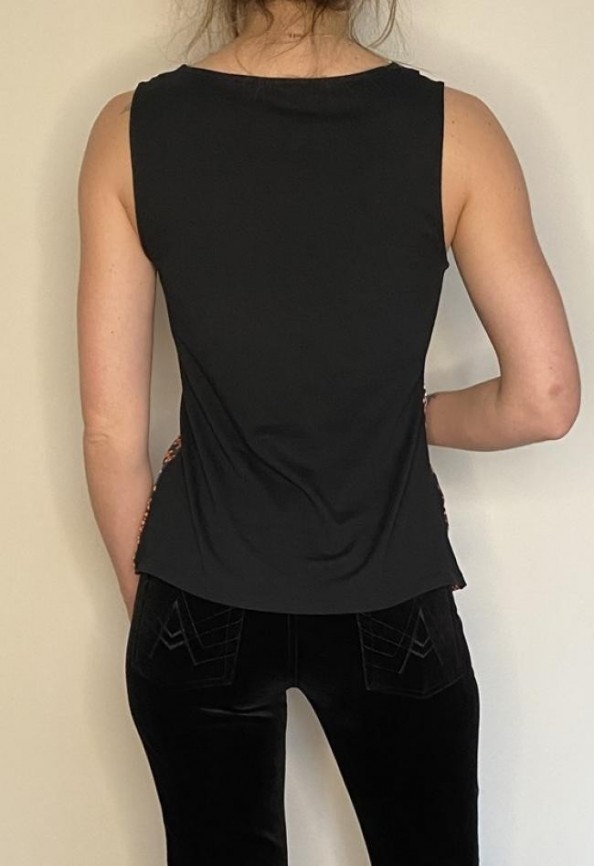 Sem etiqueta de composição. Confeccionada com dois tons de tecido, sendo que é uma malha preta atrás com elasticidade. A da frente também tem um pouco de elasticidade. Códigos na etiqueta interna: ID: 70107 330 147. Aparência ótima.