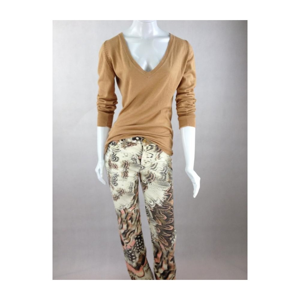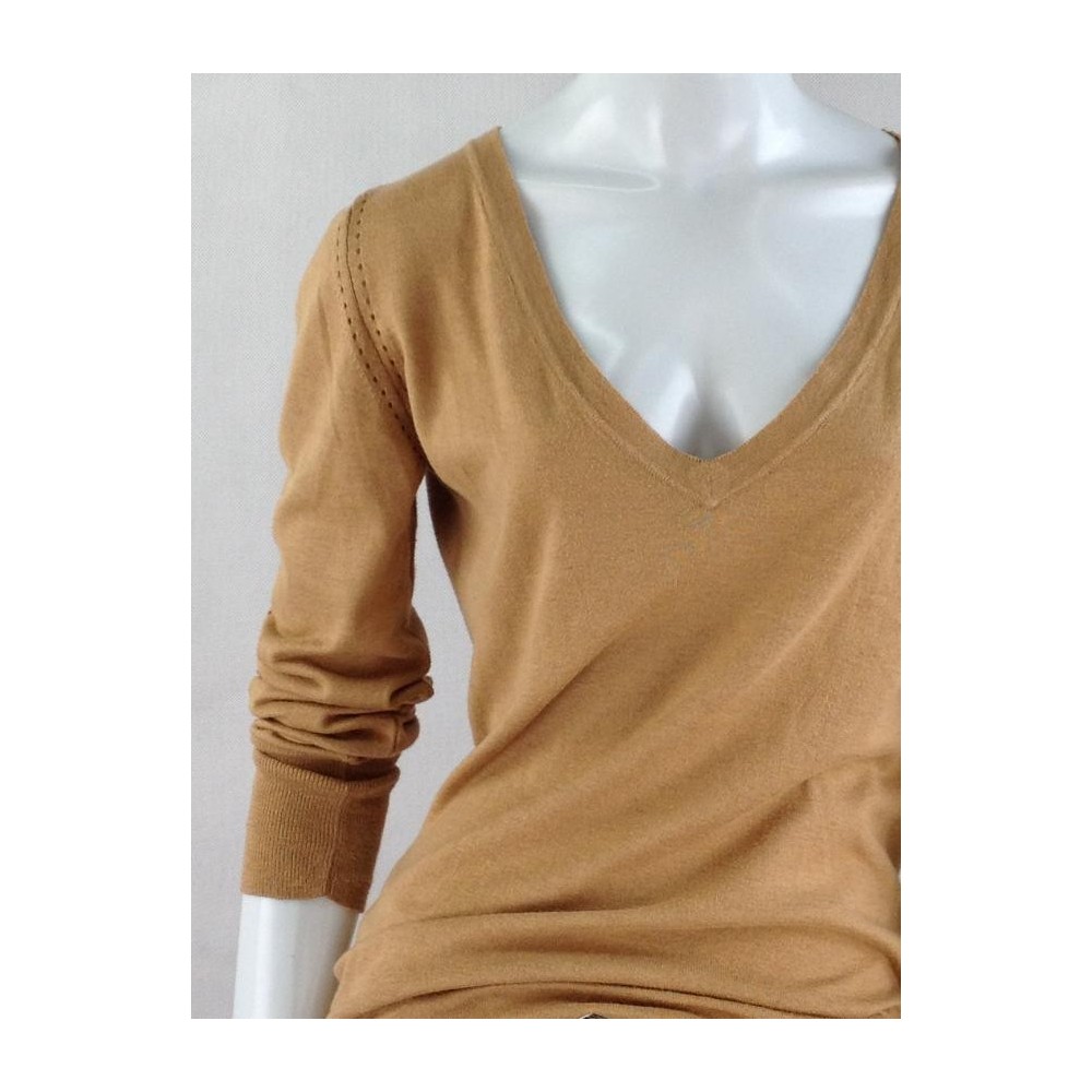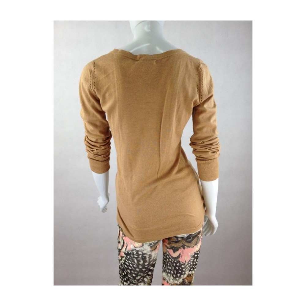 Gola em V, punhos sanfonados. Aparência ótima. Um pequeno furinho no punho.