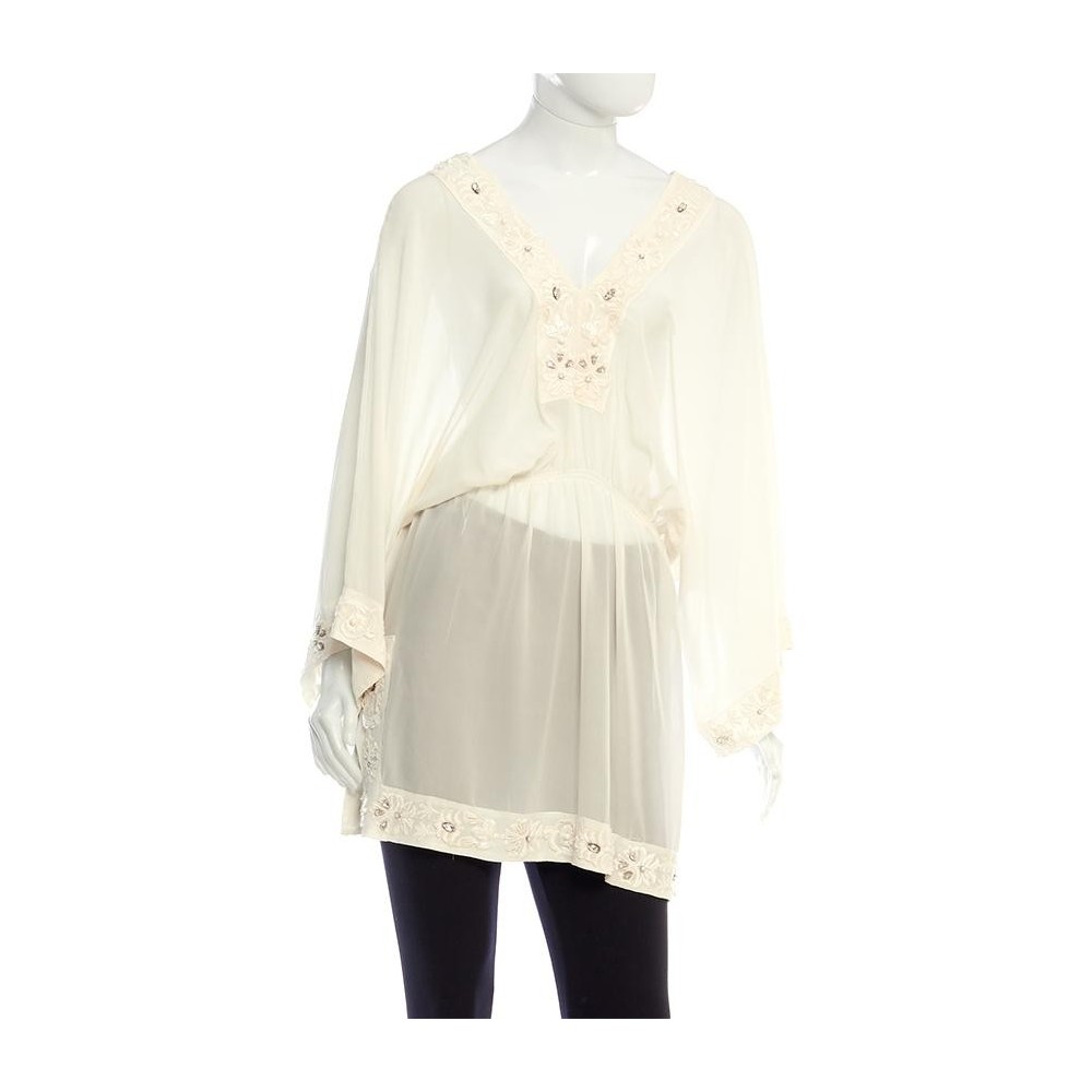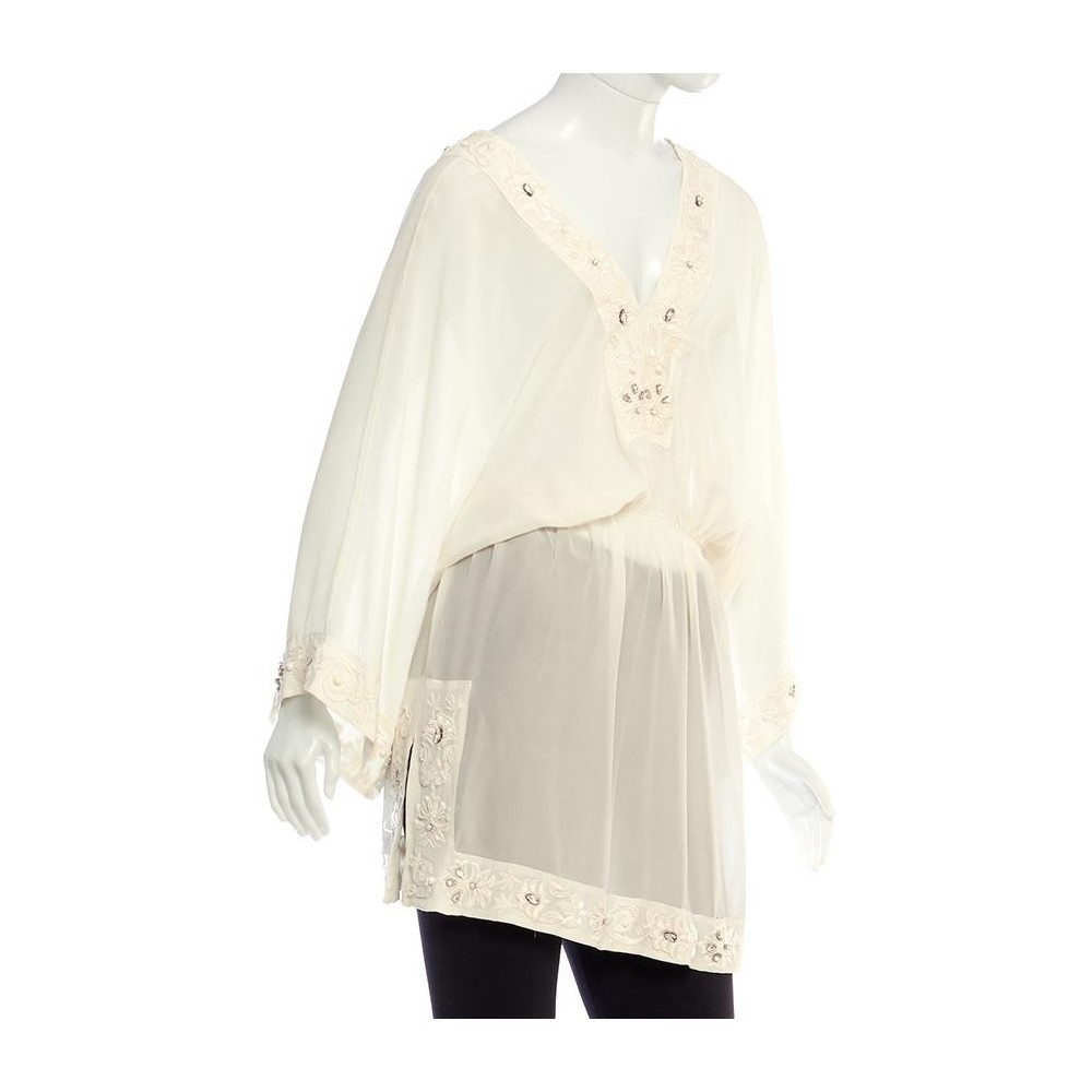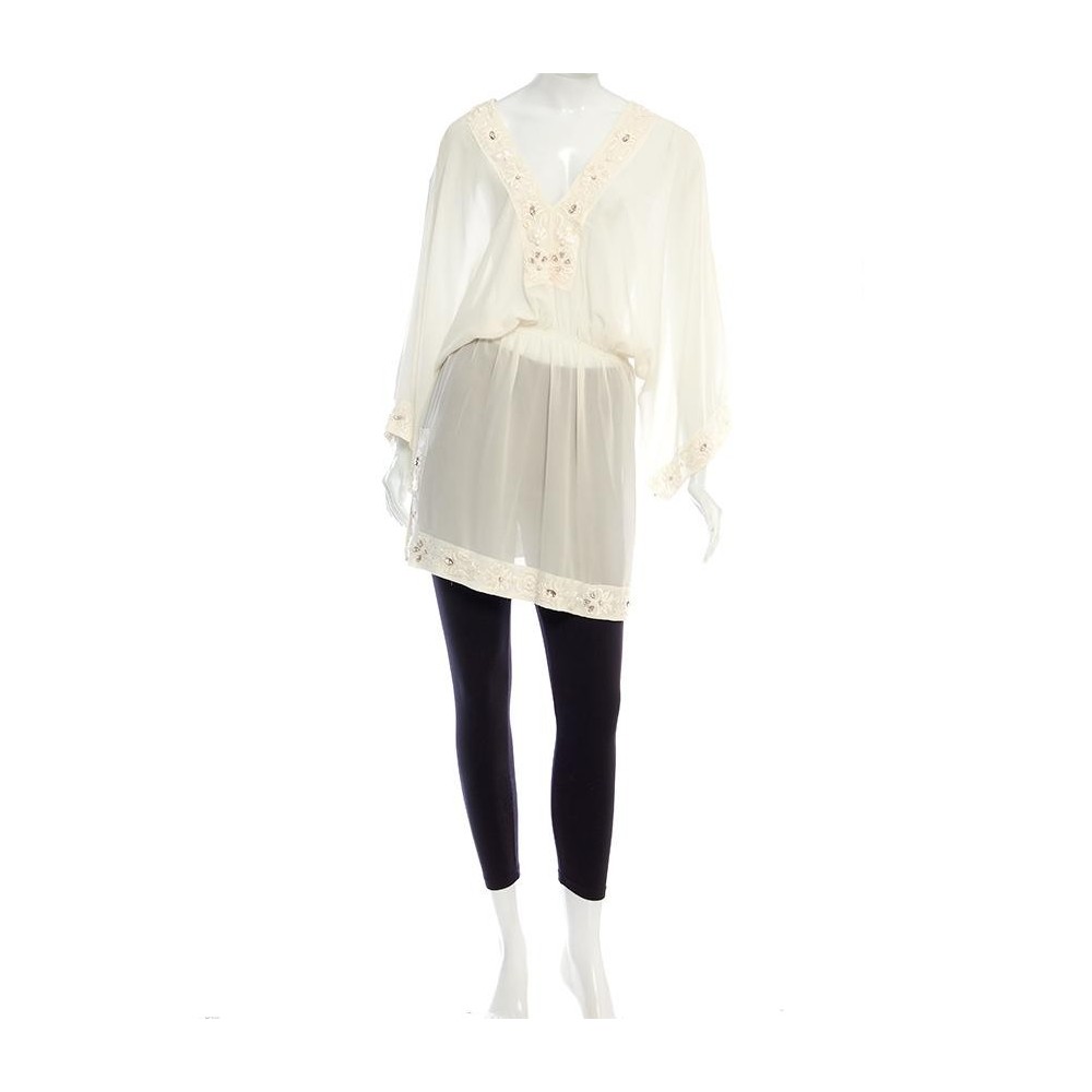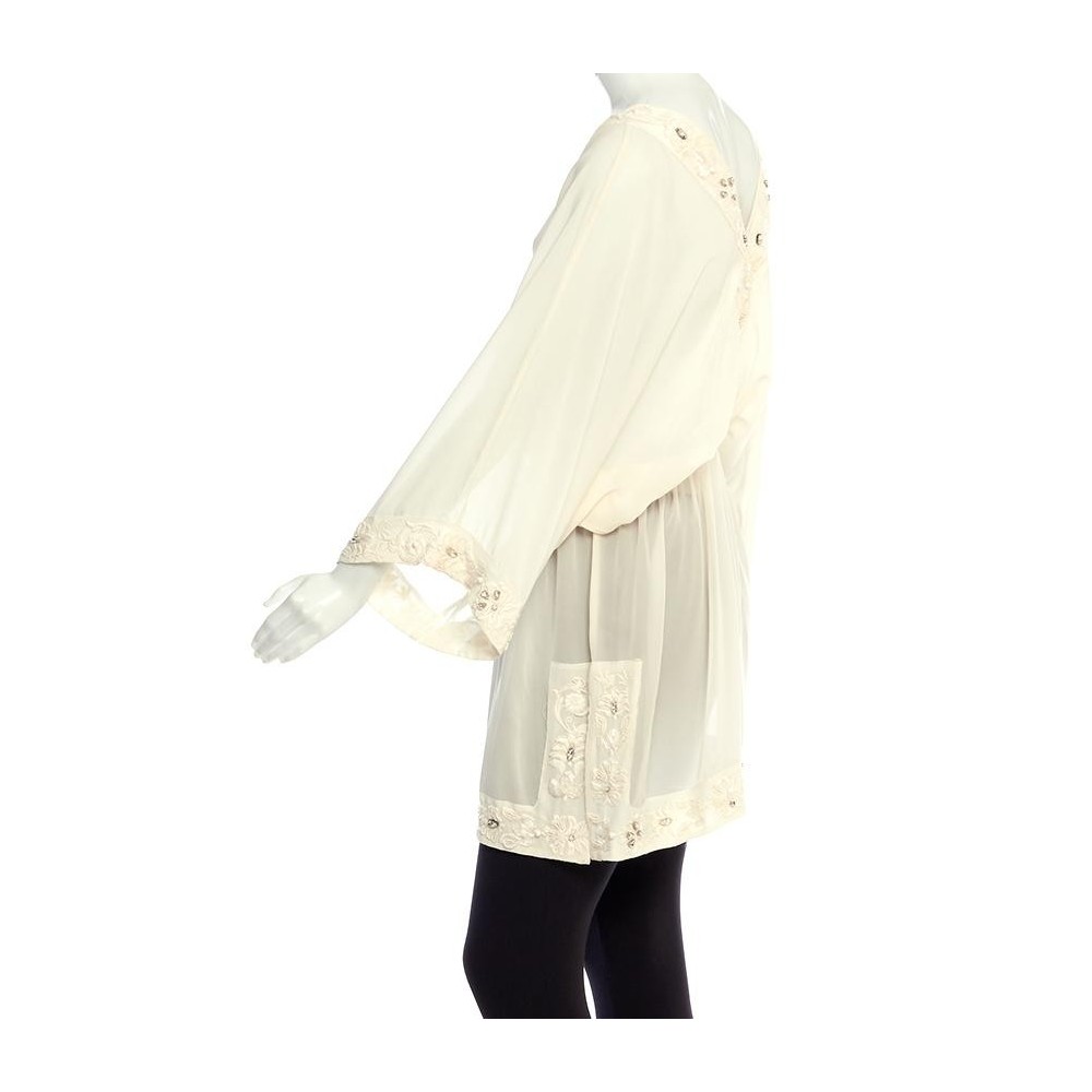 ORIGEM ITÁLIA. Confeccionado em 100% Seda. Decote em V na frente e nas costas, contornado por bordados em linha, pedrarias e pérolas sintéticas. Elástico na cintura. Mangas 7/8 com bordados no punho. Laterais abertas e barra bordada. Aparência de nova. Etiqueta XS, veste 38/40.