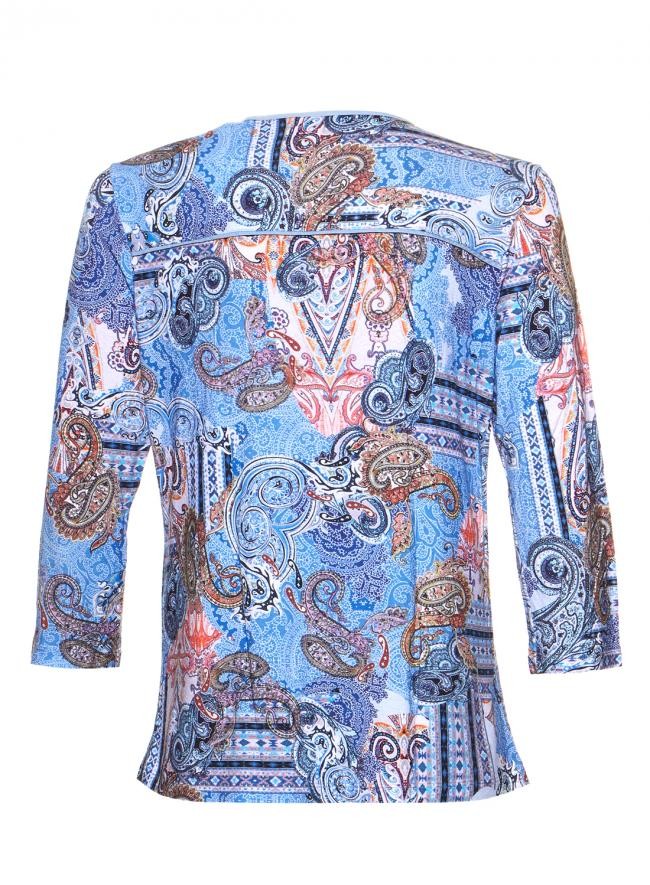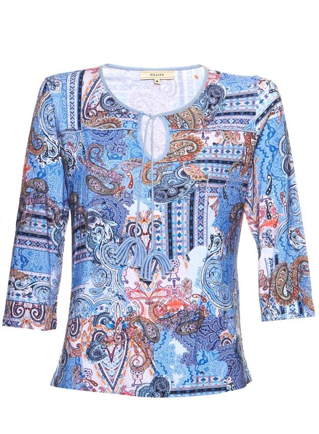 Decote em V com fita para amarrar com pompom. Tem uma mini mancha nas costas na altura do decote (veja a foto) Tons de azul e coral.