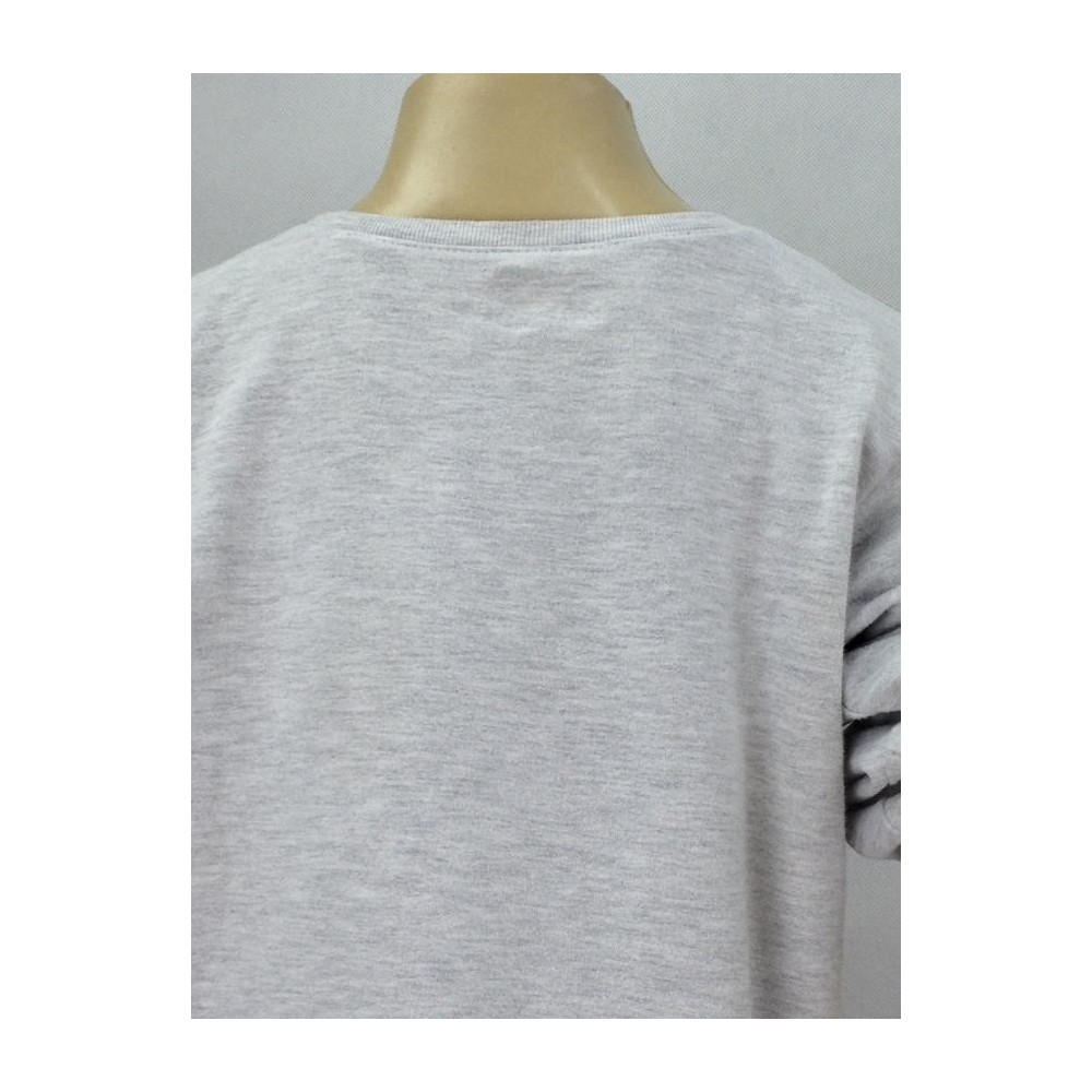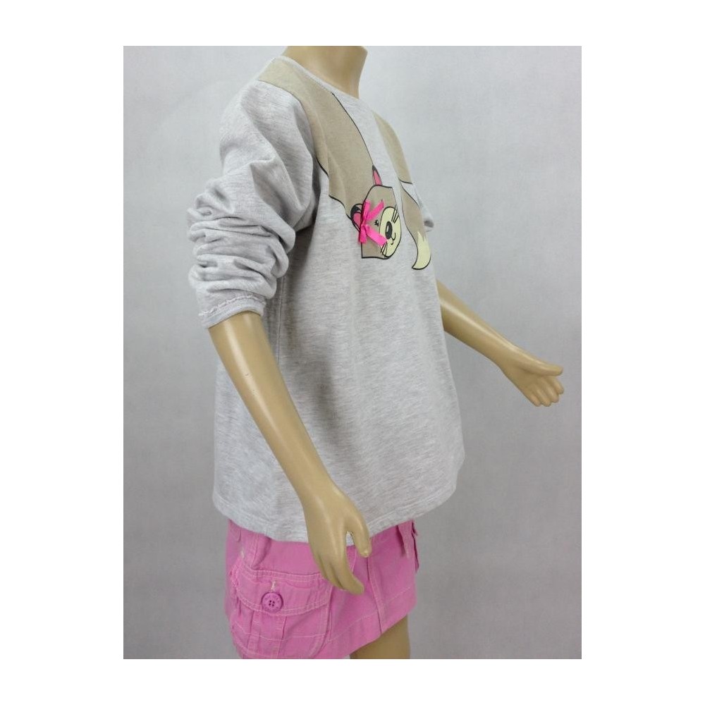 Blusa cinza com estampa de gatinho na gola e lacinho. Mangas longas com babados no punho. Aparência ótima.