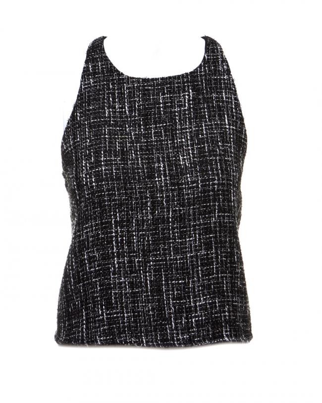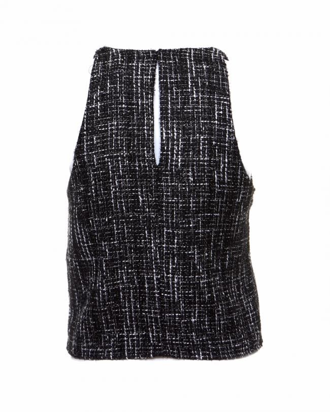Bouclé com linhas pretas, brancas e metálicas. Forrada. Tem um botão atrás. Tamanho M na etiqueta, mas confira as medidas aproximadas: comprimento = 50 cm, busto = 86 cm.