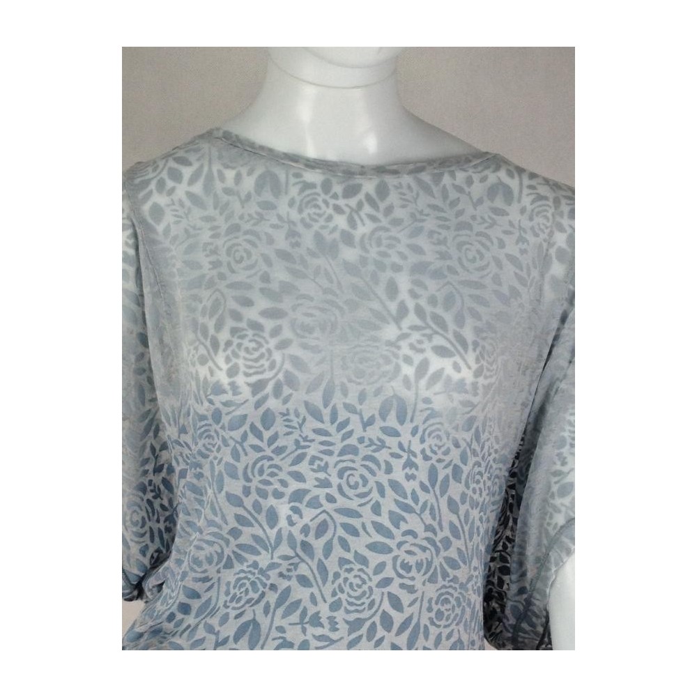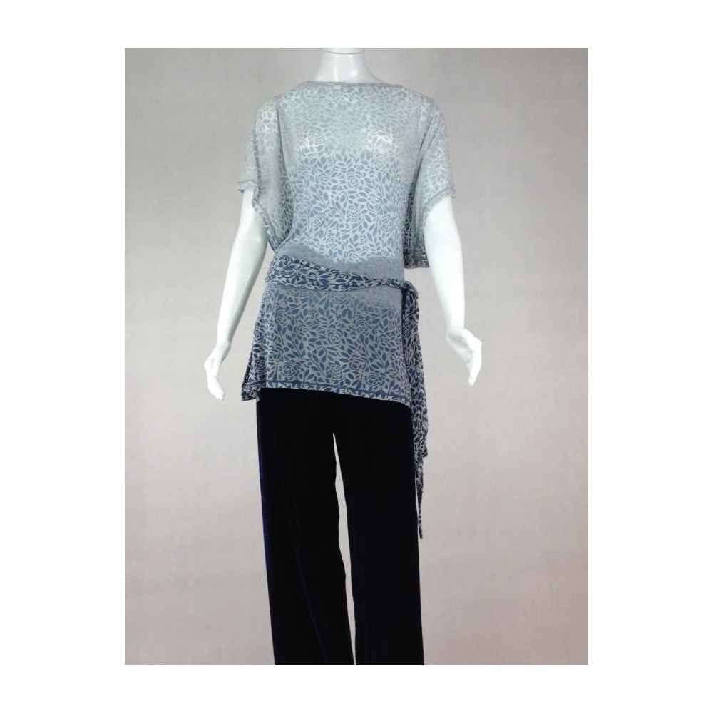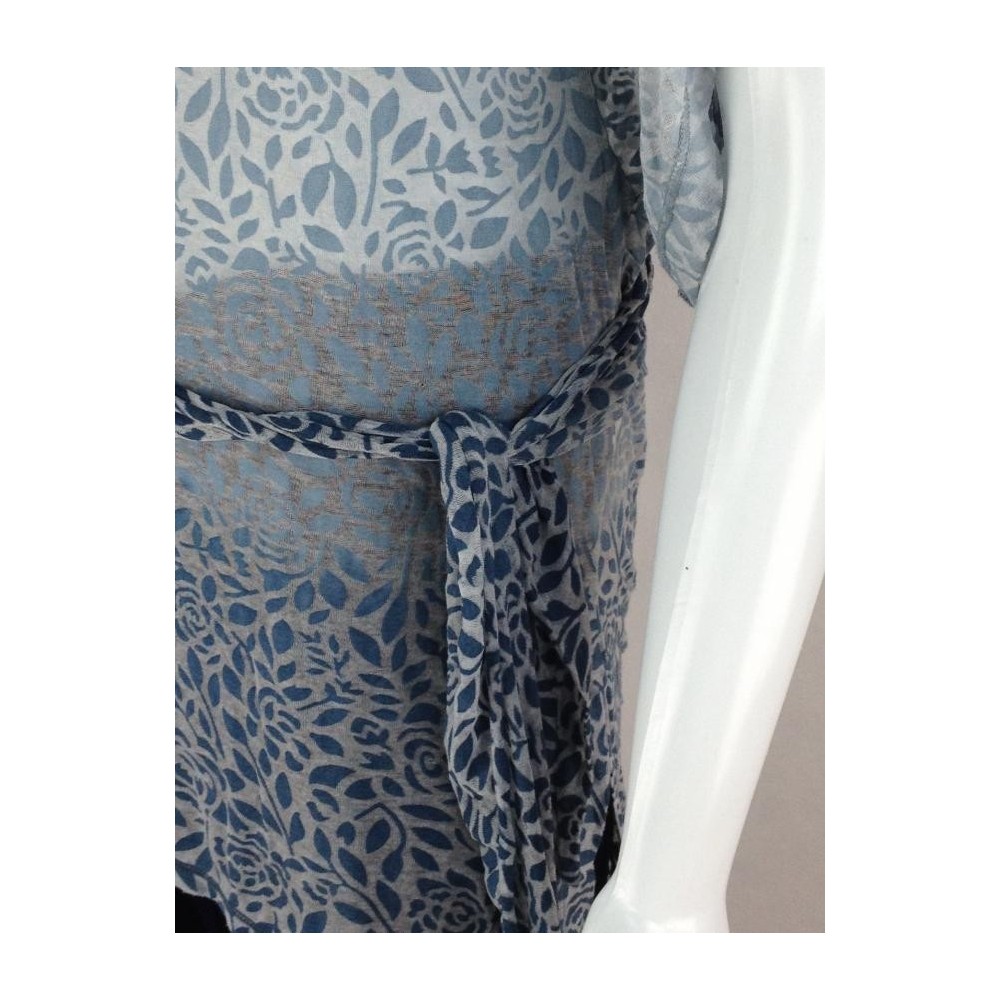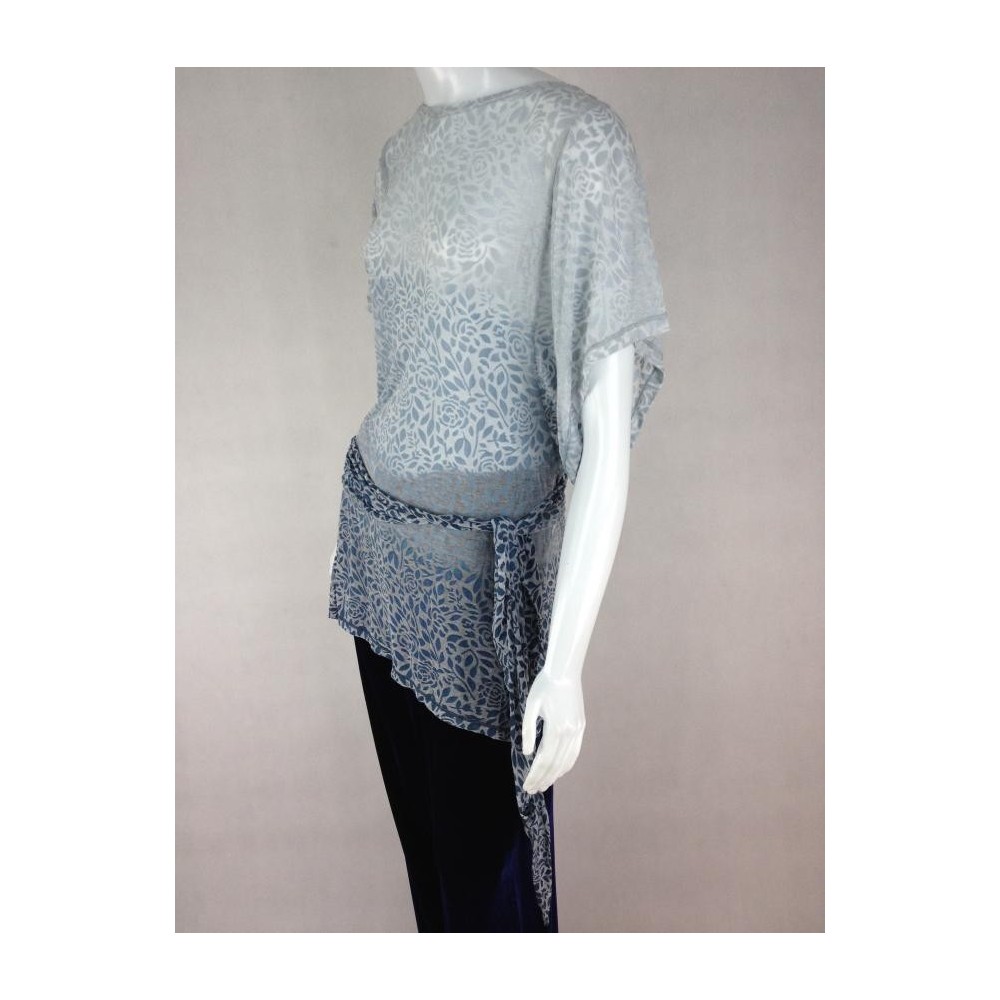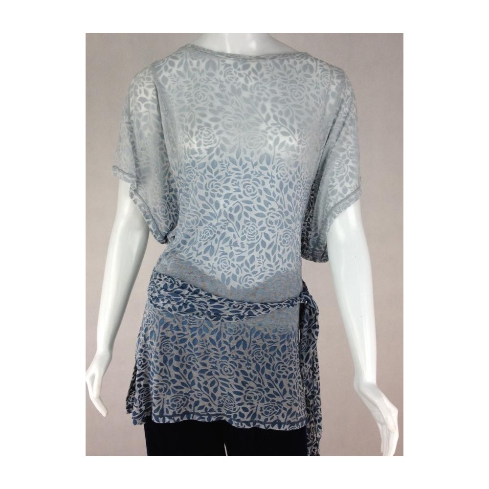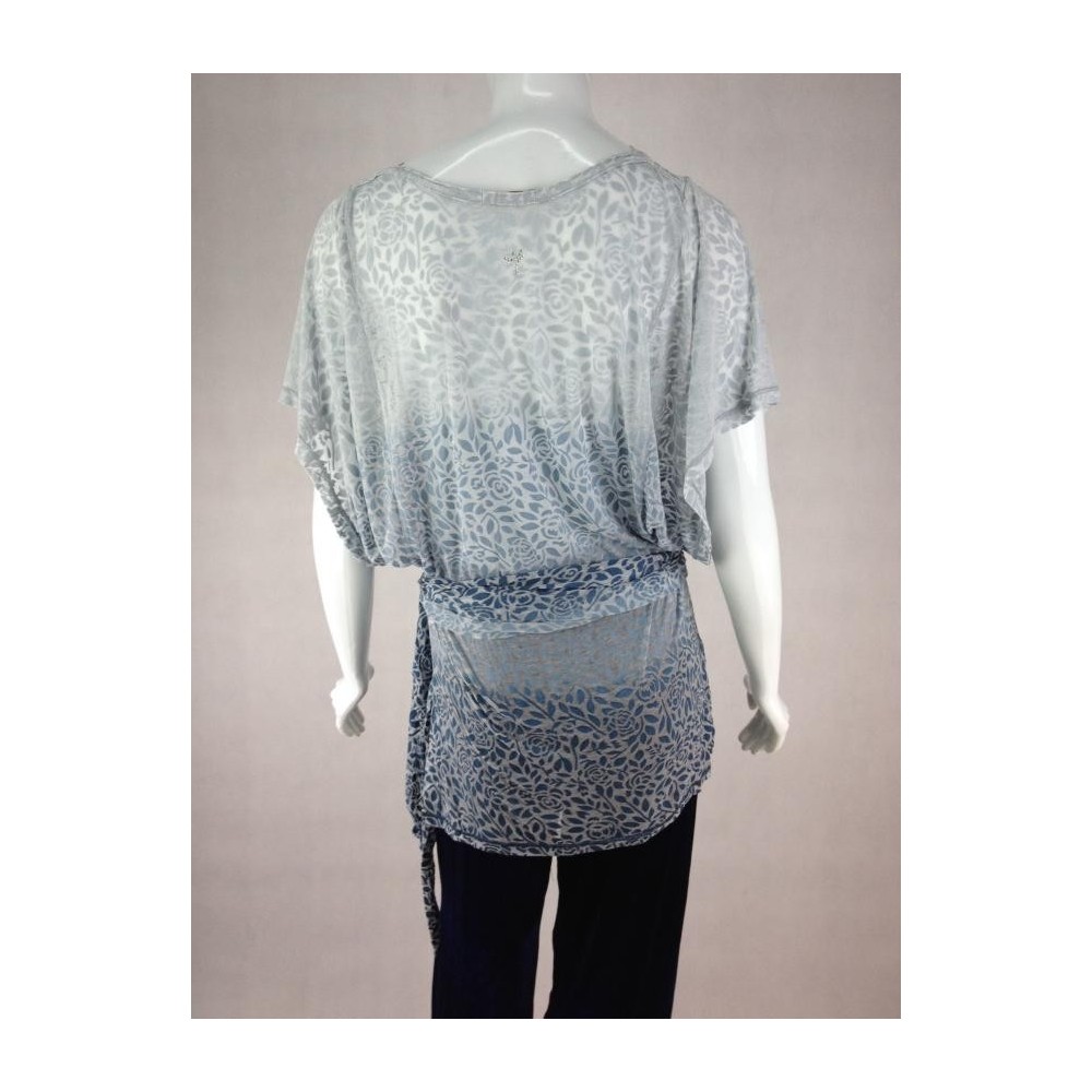 Blusa transparente em tons de azul degradê, com faixa na cintura para amarração. Gola careca, mangas curtas, soltinha. Aparência de nova.