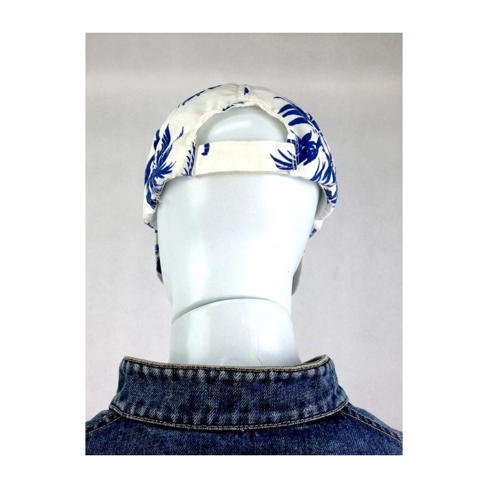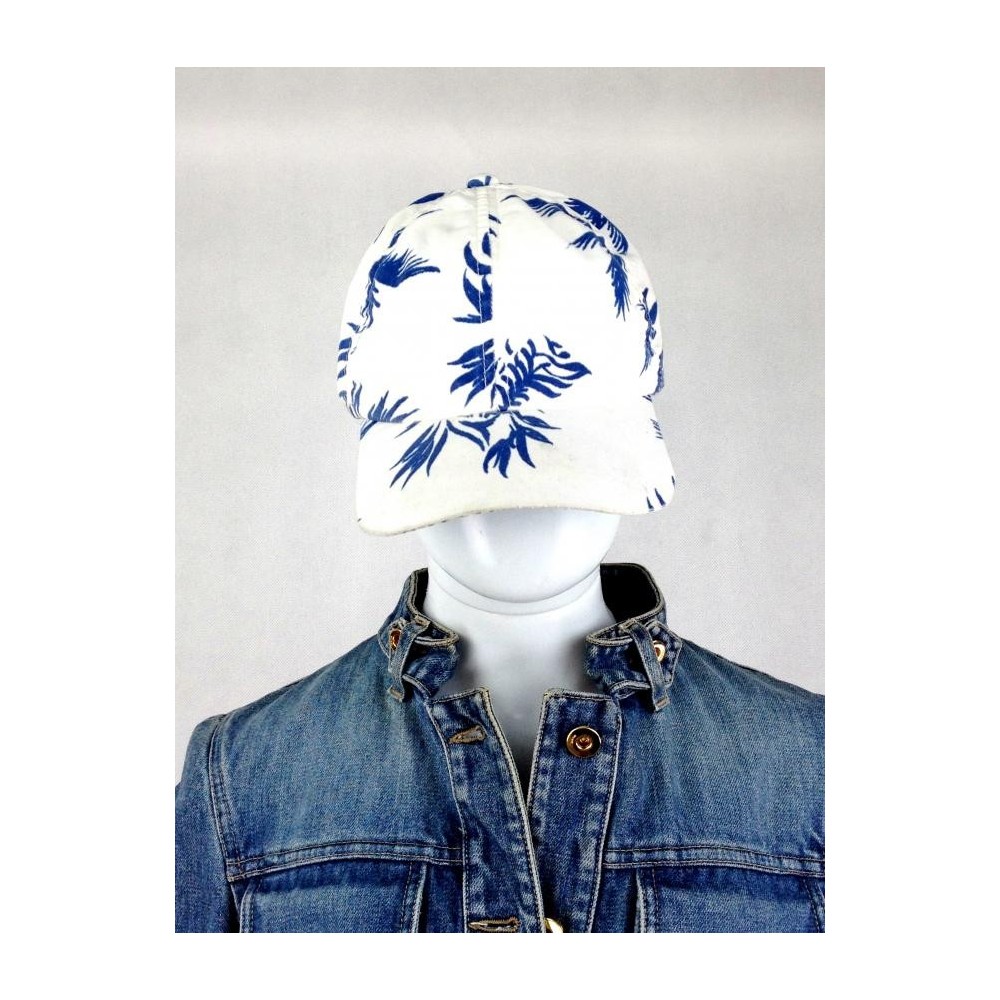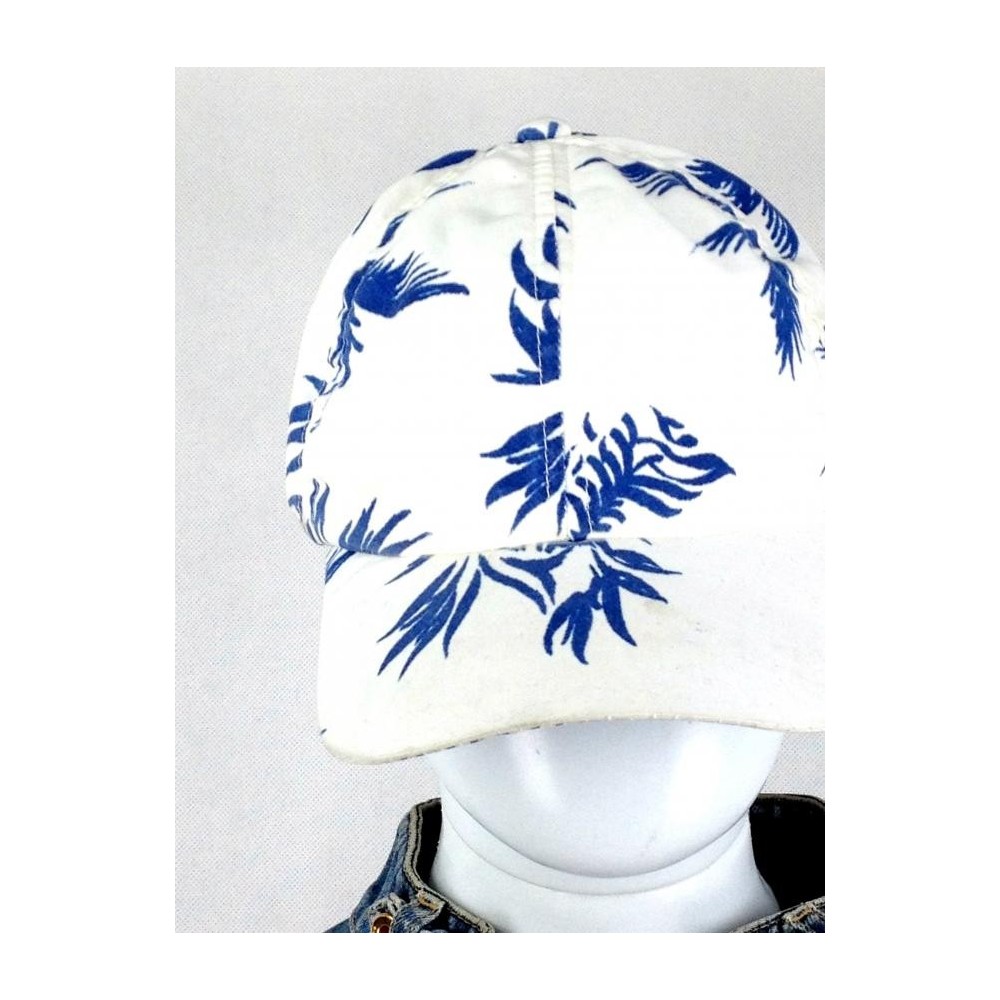Confeccionado em 100% Poliéster. Fundo branco com detalhes em azul. Fechamento atrás com velcro. Obs. Recomenda-se lavar a aba. Há vestígios de uso.