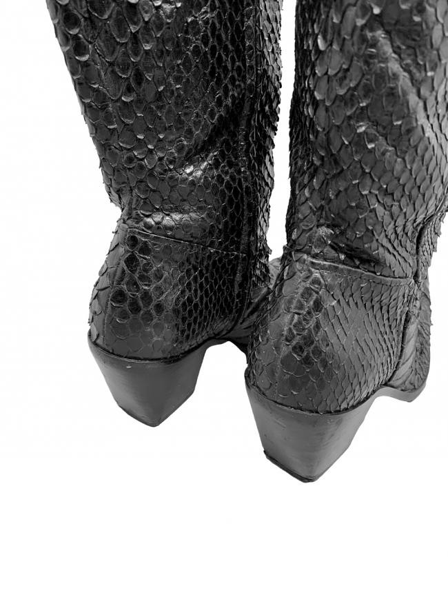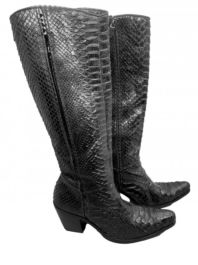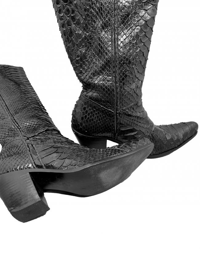 Confeccionada em couro python. Os artigos sofisticados da designer Angela di Verbeno são uma referência em calçados. Salto grosso 7, cano alto, feita à mão. Zíper na lateral. Alguns vestígios de uso no couro e no salto.