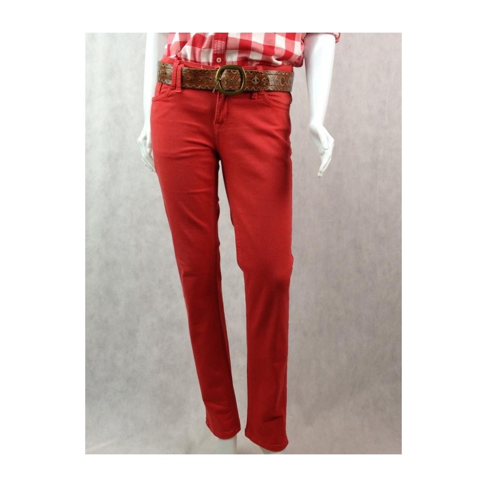 Fechamento com zíper e botão. Passantes para cinto. Na cor vermelho tomate. Algodão 95%. Elastano 5%. Aparência perfeita.