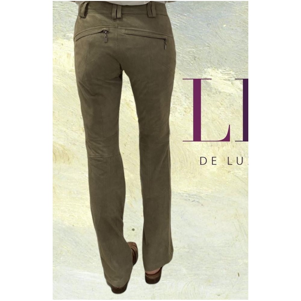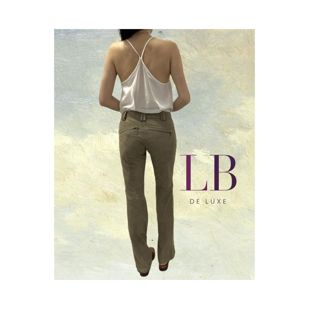 Calça Cris Barros de camurça cinza. Forro até a altura dos joelhos, modelagem justa com abertura na barra para zíperes. Bolsos na frente e dois boslos atrás que fecham com zíper com puxadores com a marca impressa. A calça fecha com botão e zíper com o puxador com a marca impressa. Botão externo transparente, recortes ao longo das pernas. Seminova em ótimo estado. Não tem etiqueta de tamanho, mas confira as medidas aproximadas: comprimento = 101 cm; cintura = 74 cm; quadril = 84 c. Preço na loja, R$ 3.750,00.