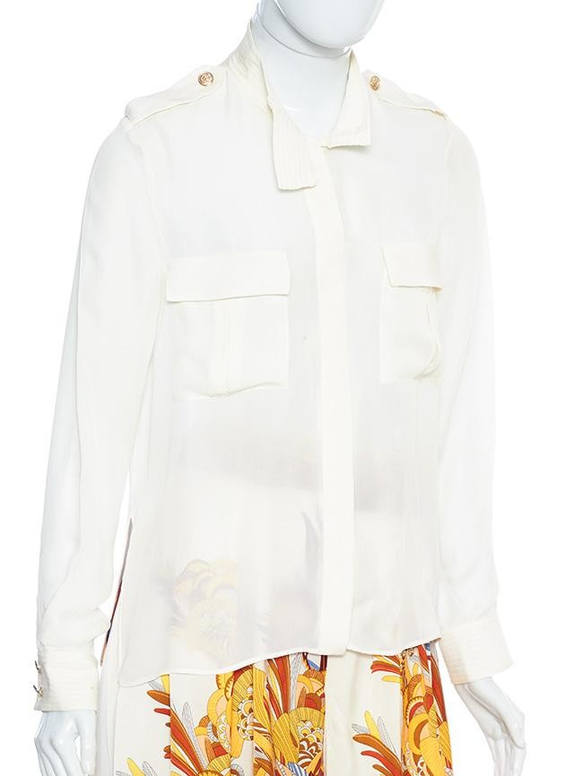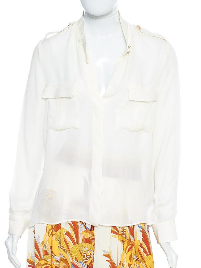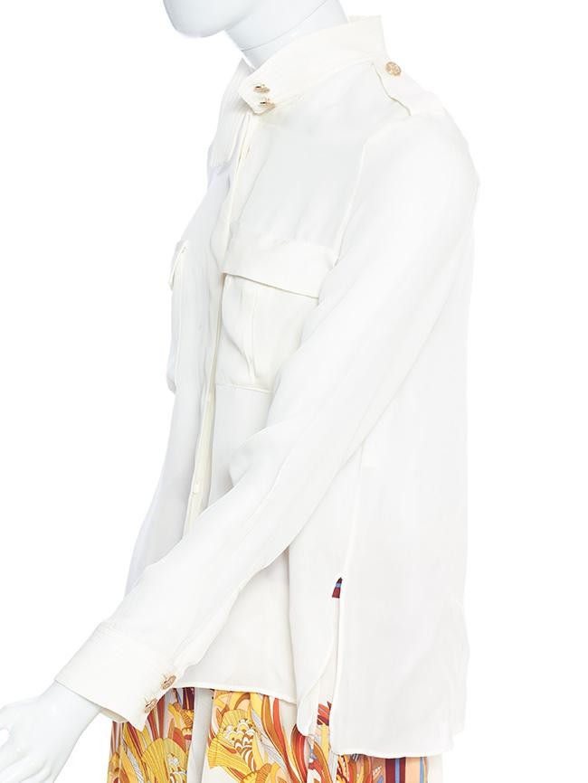 Confeccionada em 100% seda. Possui dois bolsos frontais, dois botões em cada punho, gola com dois botões , ombros com uma pequena faixa e um botão cada lado ,uma abertura nas laterais. Fechamento por botões. Na etiqueta USA-XS , EUR-XS .Mas veste 40 nacional. Um botão sobressalente. Aparência de nova.
