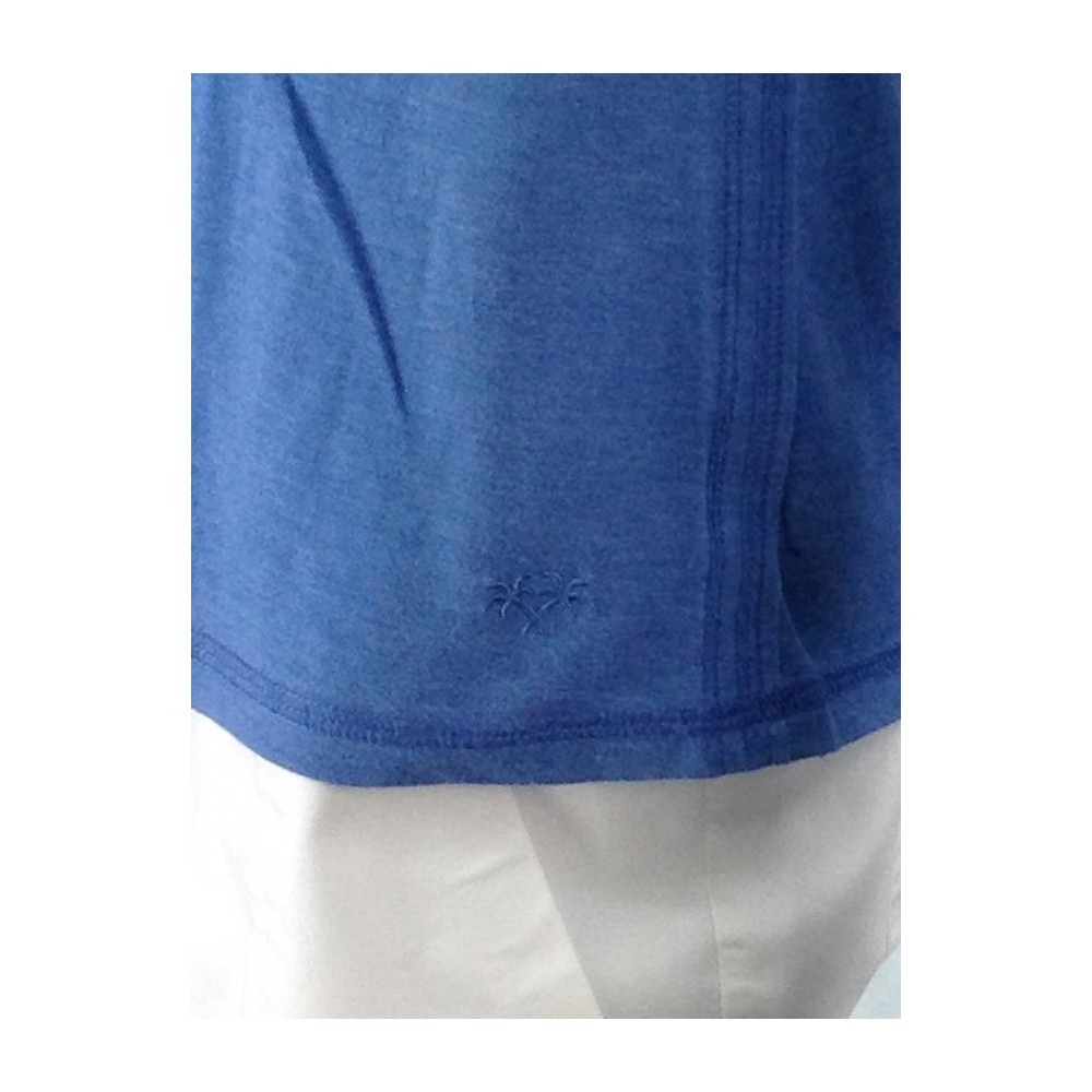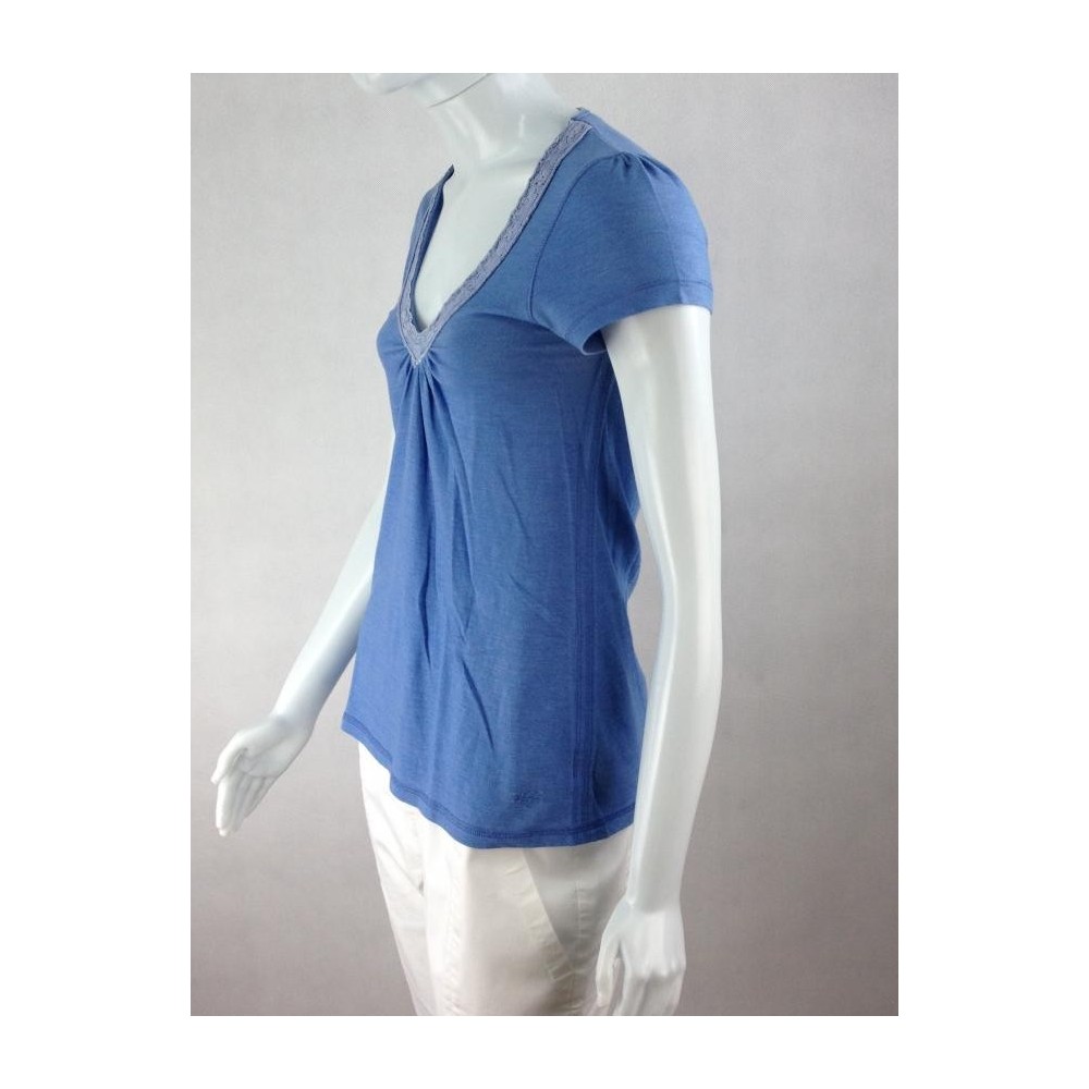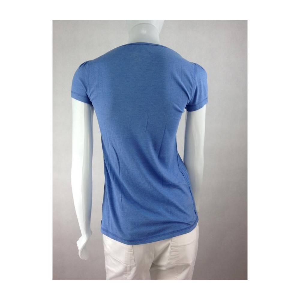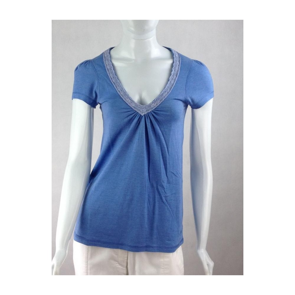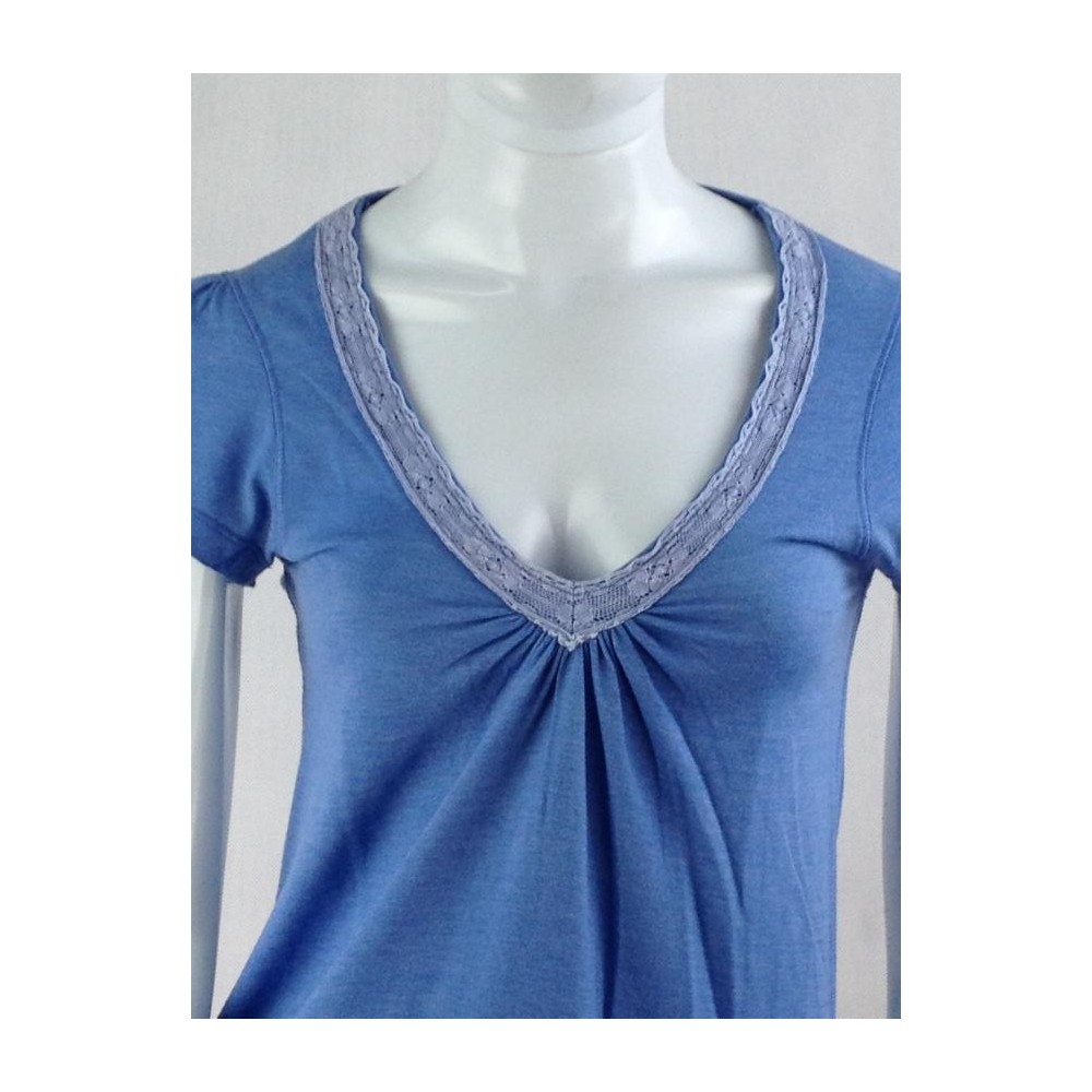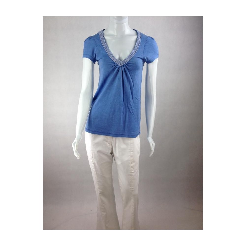 Modelagem evasé. A etiqueta de composição foi cortada, mas deve ser algodão com elastano. Deve servir também 40. Decote em V com renda. Logo bordado. Ótima aparência. Medidas aproximadas: comprimento = 64 cm, ombro = 34 cm, busto = 80 cm, cintura = 78 cm.