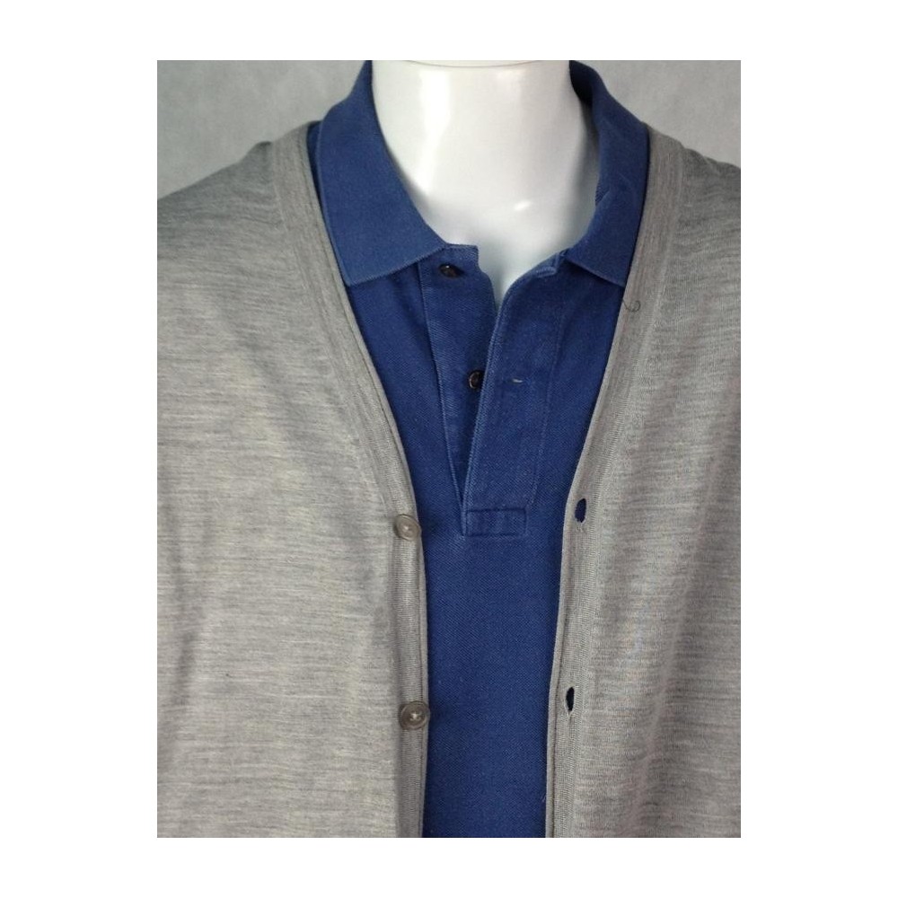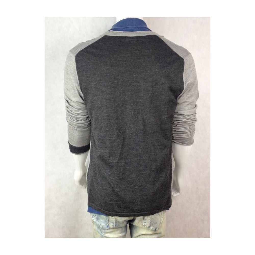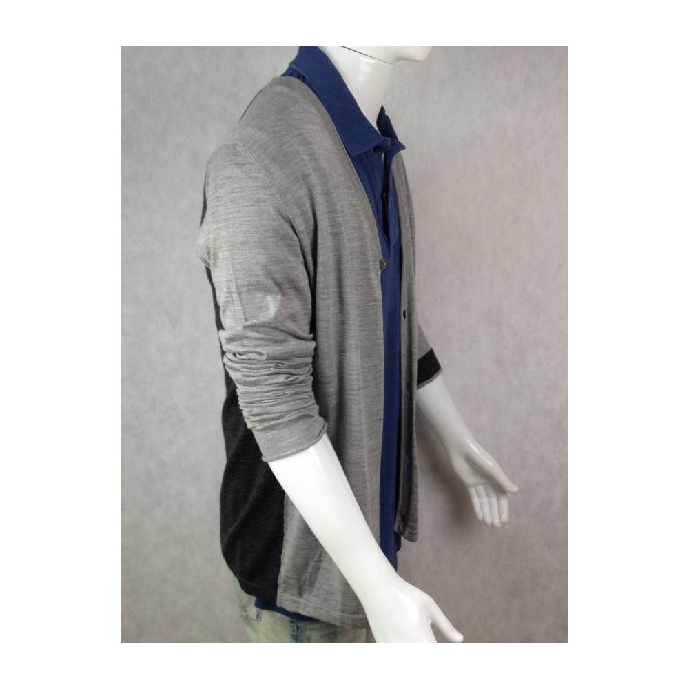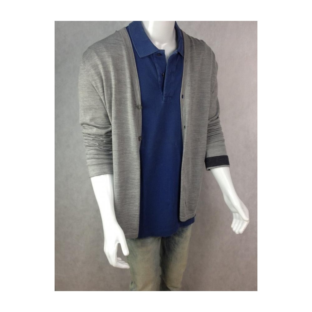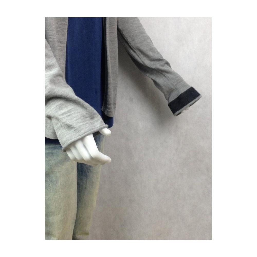 MADE IN ITALY. Mangas diferentes no punho. 30% Seda, 70% Lã. O punho de uma das mangas aparenta ter sido cortado. Cinza claro mescla na frete e cinza escuro mescla atrás. Medidas aproximadas: obro = 45 cm; busto = 108 cm; cintura = 102 cm; comprimento = 74 cm. Tamanho na etiqueta interna = 54, mas pelas medidas deve vestir M/G no Brasil.