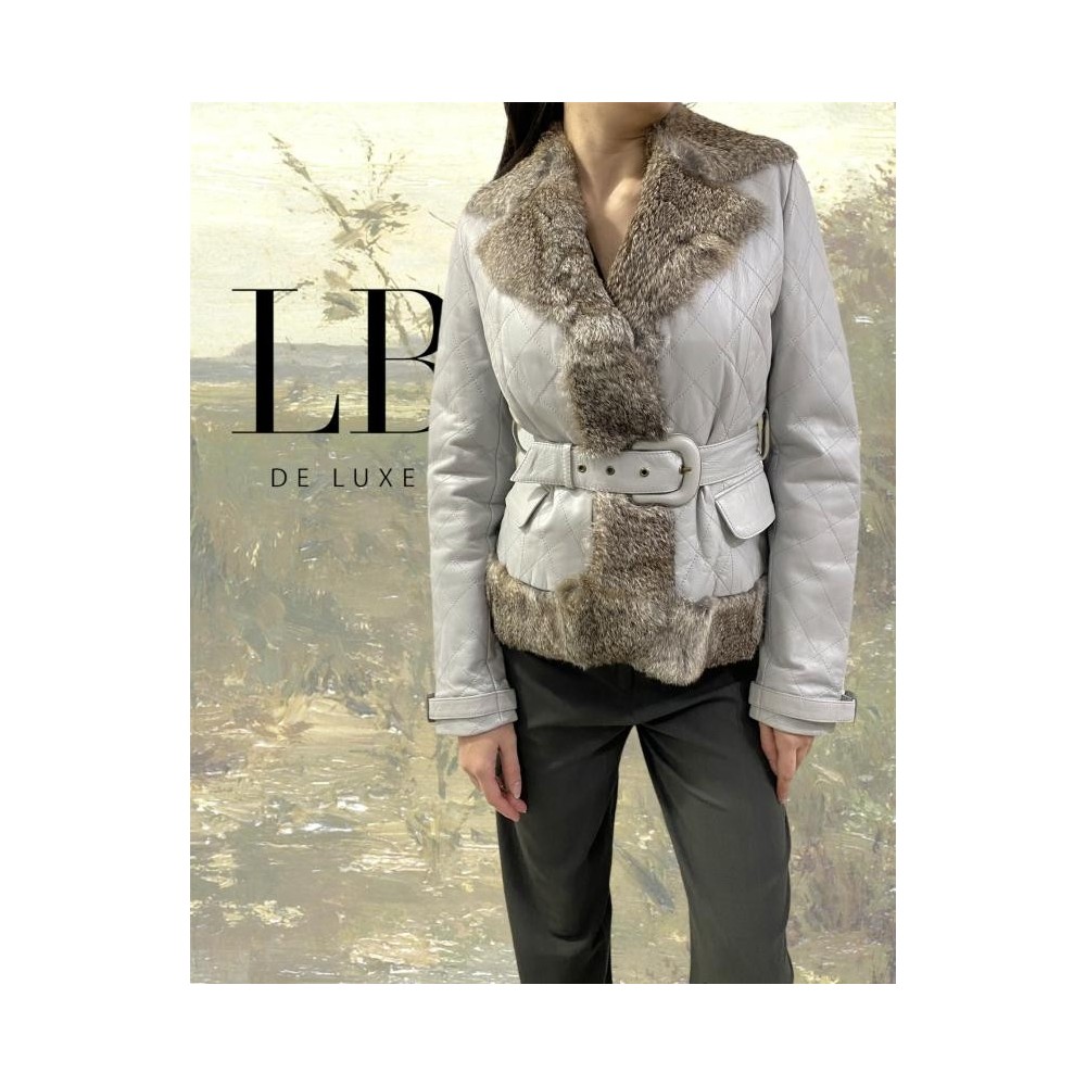 Confeccionada em 100% couro cinza matelassé. Detalhes em pele de coelho. Forrado, dois bolsos. Passantes, cinto no mesmo couro. Medidas aproximadas: comprimento = 63 cm; busto = 90 cm; cintura = 88 cm; quadril = 90 cm. Em excelente estado de conservação.