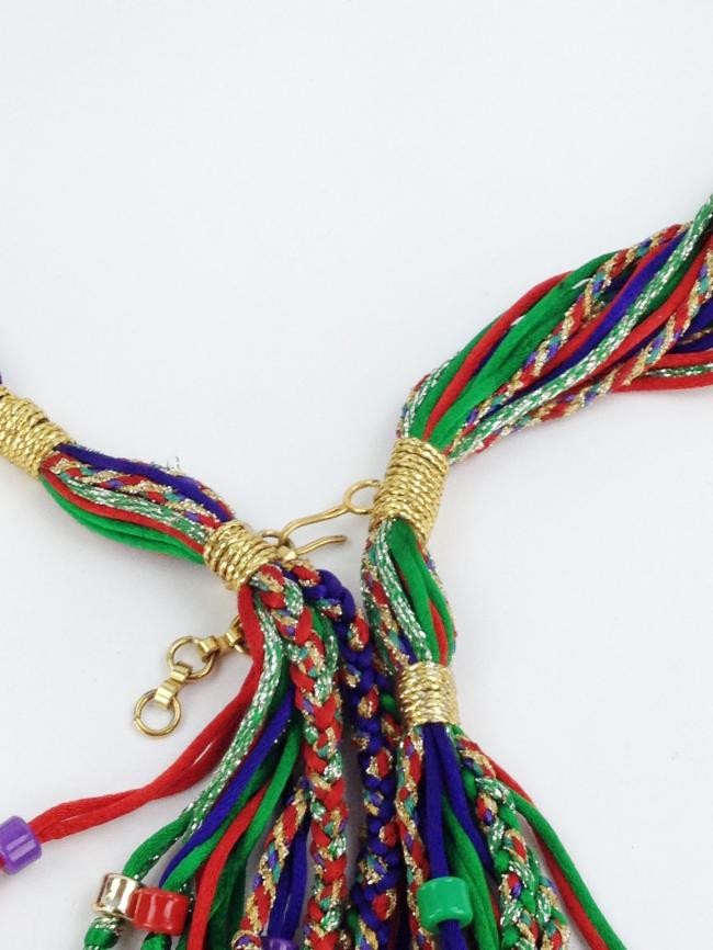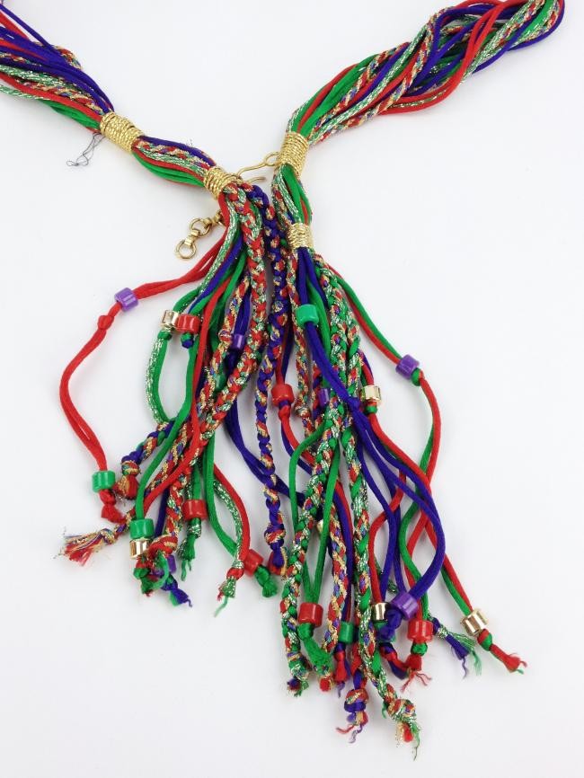 Tranças verdes, vermelho, roxo, argolas de várias cores, elos dourados. Comprimento aproximado de 84cm (de fecho a fecho) ou 120 (ponta aponta). Aparência de novo.