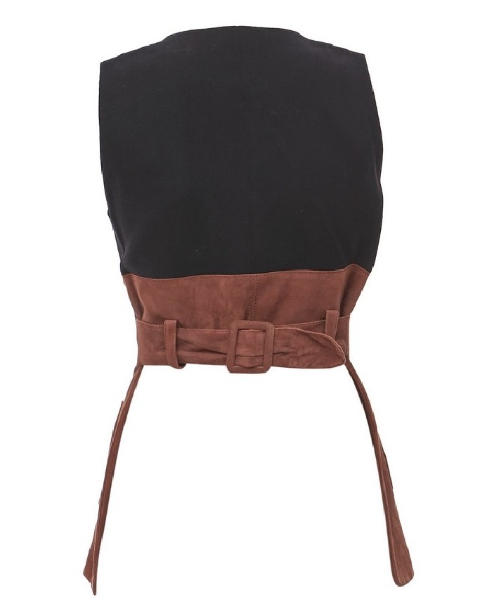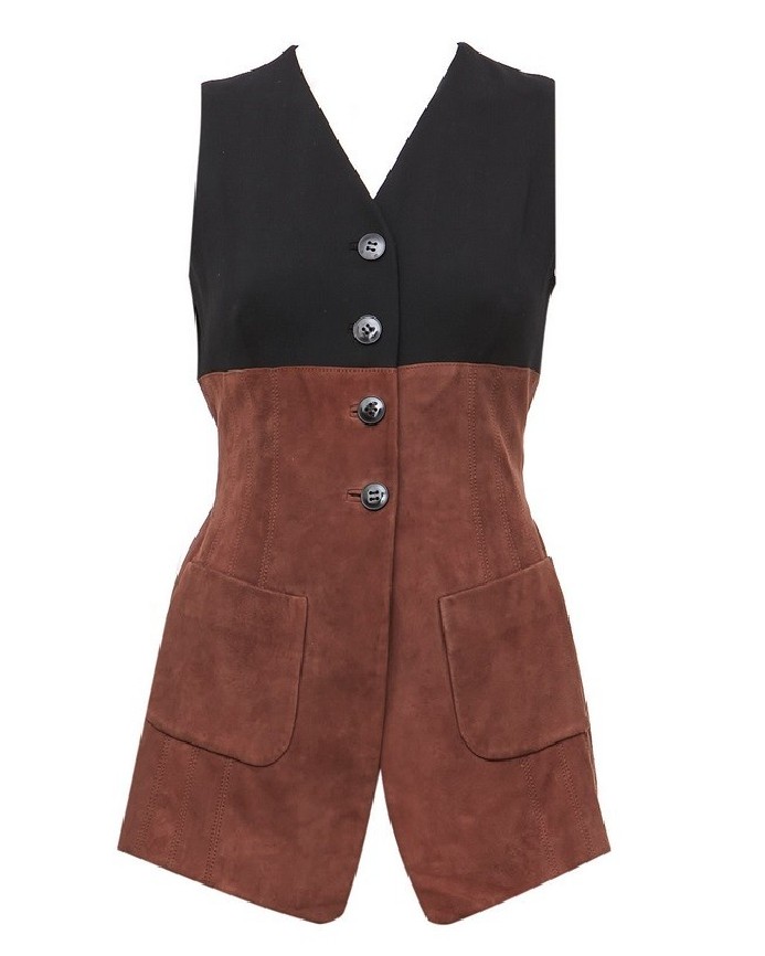 ORIGEM ITÁLIA – Confeccionado em tecido 100% lã (preto, na parte de cima) e 100% camurça (suede, na parte debaixo). Assimétrico, forrado, tamanho 40 italiano, mas confira as medidas aproximadas na frente: comprimento = 76 cm; busto = 78 cm; cintura = 72 cm; quadril = 82 cm. Nas costas, o comprimento = 40 cm. Na parte de trás, detalhe de uma faixa de suede ajustável com fivela e com passantes. Aberto na frente e fecha com quatro botões. Dois bolsos na frente. Aparência ótima.