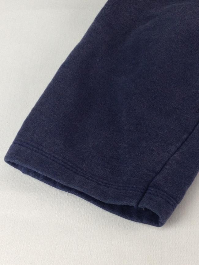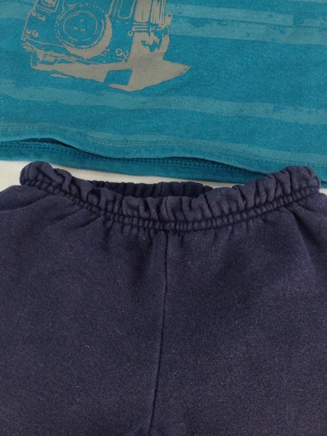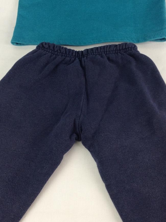 Conjuntinho infantil masculino, Pity Luly. Calça de moletom azul marinho com elástico na cintura. Camisa de moletom azul piscina com escritos e desenhos cinzas e azul marinho. Tamanho 1, para crianças de 1 ou 2 anos.