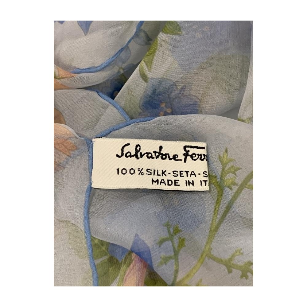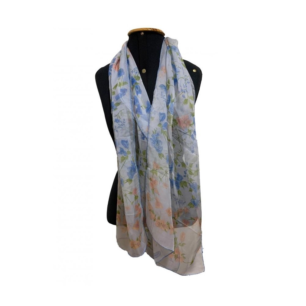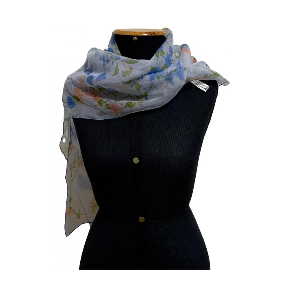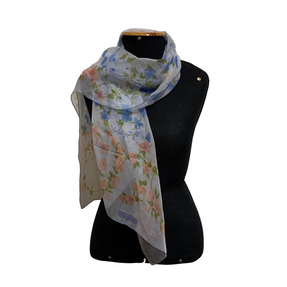 ORIGEM ITÁLIA – Confeccionada em 100% seda. Perfeita ! Linda ! Fundo azul claro com flores azuis e rosas. Roloté em linha azul de seda. Etiqueta com a marca e impressa na écharpe. Mede 160 x 41 cm. Preço na loja, R$ 2.250,00. Aparência perfeita !