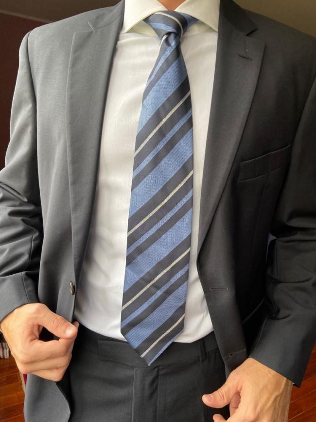 ORIGEM ITÁLIA – Mada in Italy – Confeccionada em 100% seda em tons de azul. Comprimento = 150 cm, largura maior = 9,5 cm, largura menor = 4 cm.