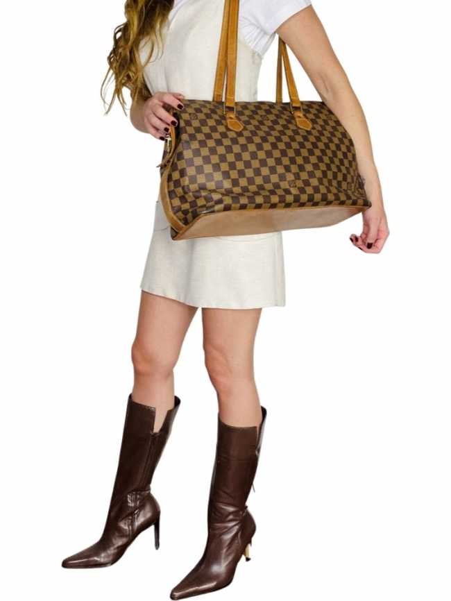 ORIGEM FRANÇA. Está é uma autêntica edição limitada Louis Vuitton Canvas Damier Chelsea Centenaire Edition, produzida em comemoração ao centenário da marca em 1996. Autenticação número 2270. O modelo é clássico e atemporal. Possui duas alças longas de couro de 35cm. Fechamento com dois zíperes com o LV gravados, com o cadeado símbolo da marca (sem chave). Tem a base estruturada que mede 40cm. Exterior ultra conservado, com pouquíssimos vestígios de uso na base e no couro lateral. Interior em perfeito estado. Bolso interno com zíper com o logo gravado. A bolsa é indispensável para colecionadores. Altura de 29cm. Largura 50cm. Profundidade 15cm.  Preço aproximado na loja: R$ 9.200,00.