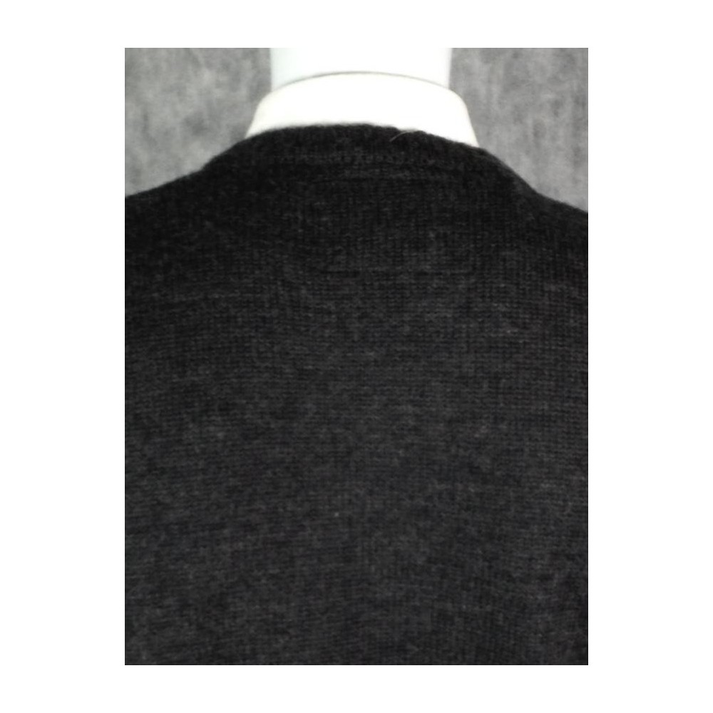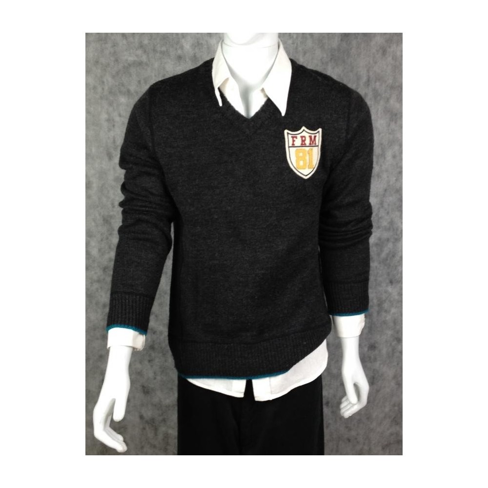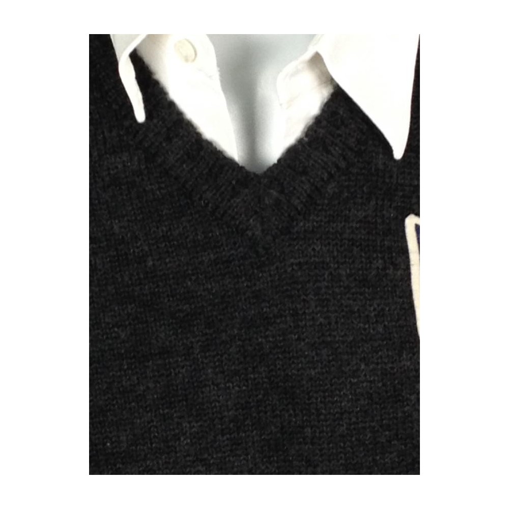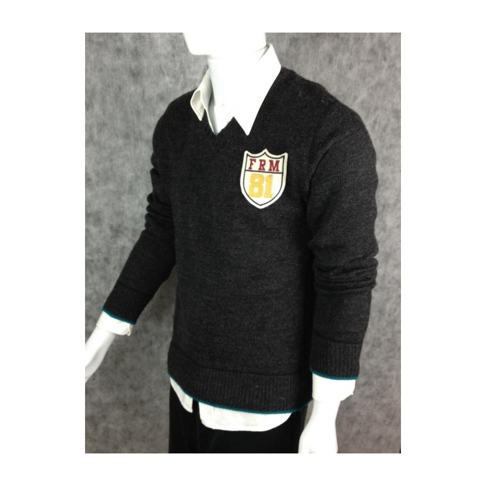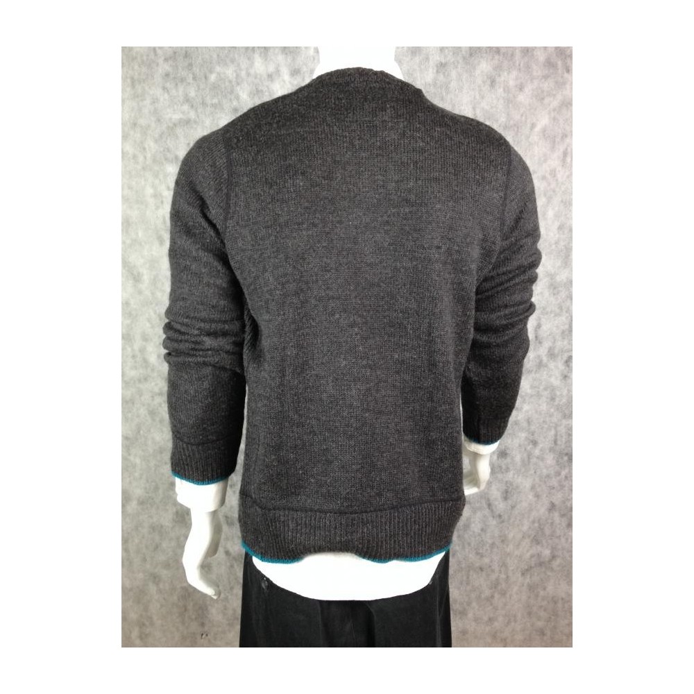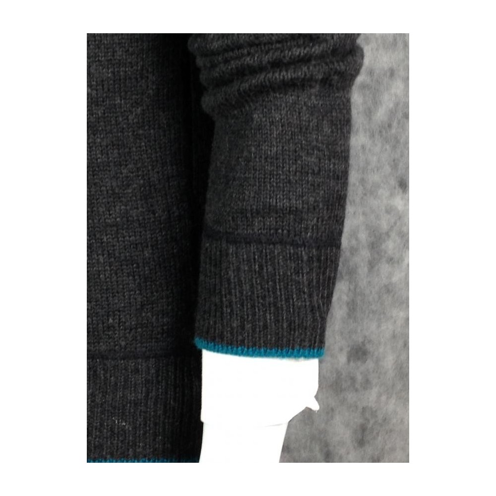35% lã e 65% acrílico, detalhe em azul nos punhos e na barra.