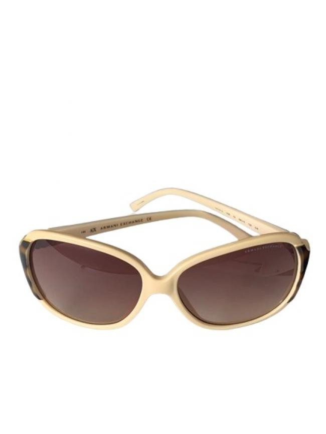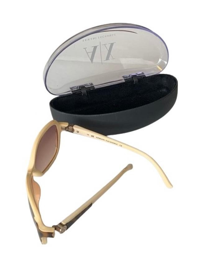 Óculos escuros Armani Exchange. AX 184s Yde 59-15 130 06 Acompanha a caixa original (com tampa transparente), flanela e certificado original. A armação é de acetato bege e as lentes tem a marca da grife impressa. Detalhes de tartaruga também nas laterais e logo da marca nas dobradiças das hastes.