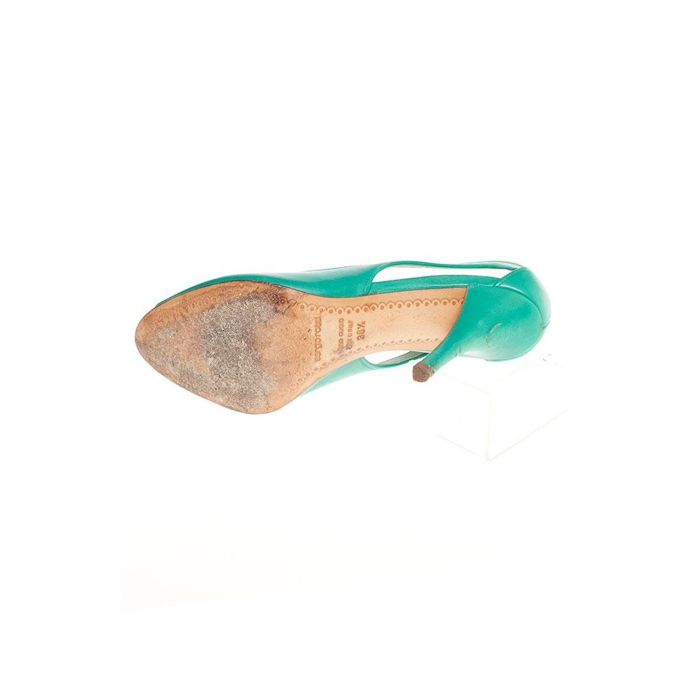 ORIGEM: ITÁLIA. Confeccionada em couro. Detalhe em laço na parte frontal. Nome da marca na palmilha e sola. Salto de 10 cm. Sola interna de 24 cm. Tamanho 38,5 na sola, mas calça 36 nacional. Vestígios de uso na palmilha e salto.