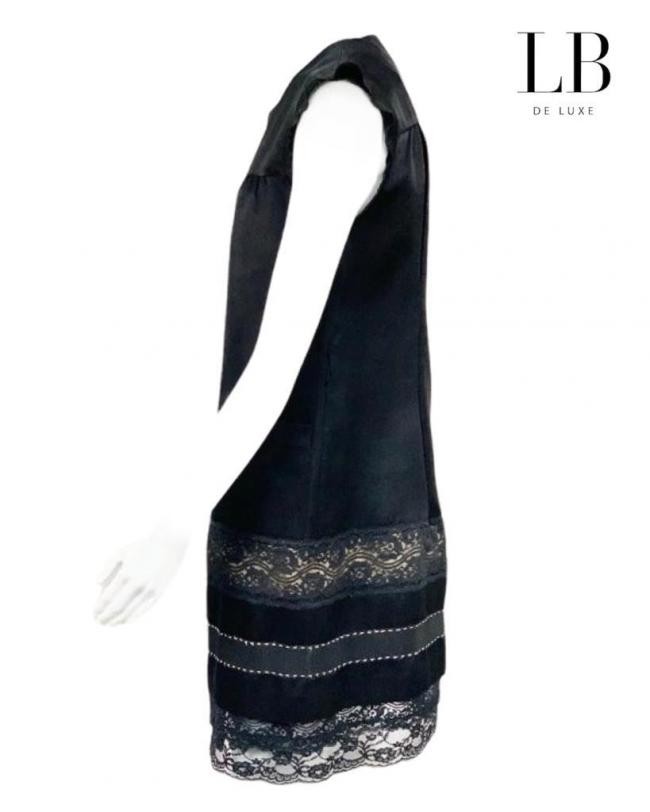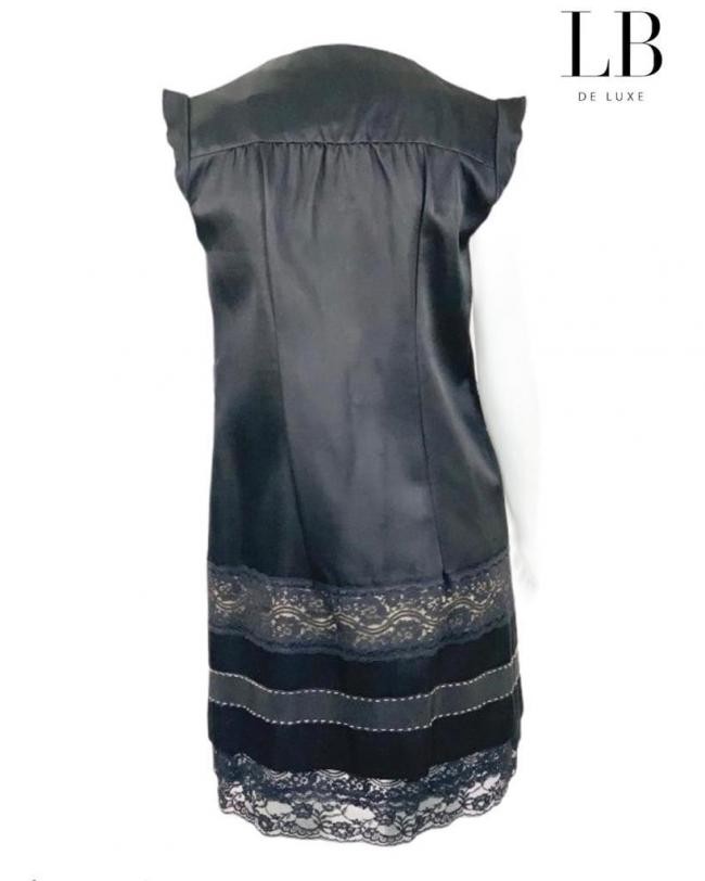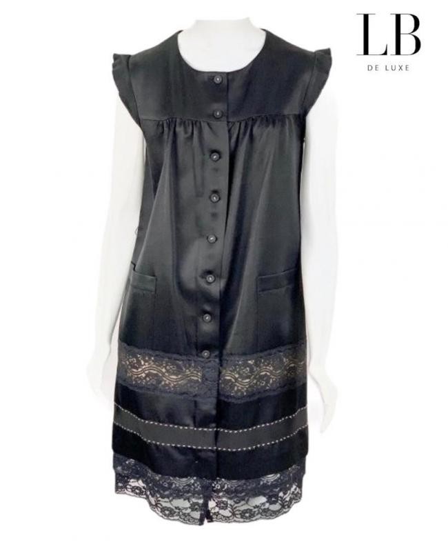 Origem : Itália. Confeccionado em 31% seda, 41% lã e 28% rayon. O vestido foi ajustado. Confira as medidas aproximadas: comprimento = 94 cm; quadril = 96 cm; cintura = 90 cm; ombro = 43 cm; busto = 89 cm. Possui dois bolsos frontais. Renda com tecido nude por baixo e uma faixa de gorgurão. Fechamento com botões forrados. Passantes de linha. Na etiqueta USA-4 , F-36 , I-8, veste 40 nacional. APARÊNCIA DE NOVO. Preço aproximado na Loja : R$ 3.900,00.