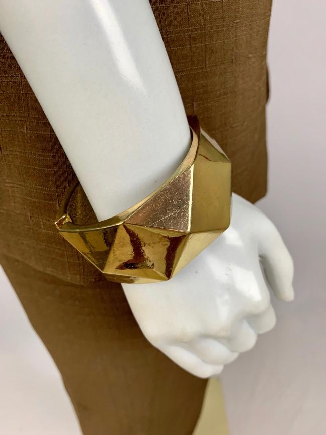 Pulseira confeccionada em metal dourado. Espessura grossa. Fecho por encaixe. Medida aproximada : 3.5 cm altura. OBS : POSSUI MÍNIMOS RISQUINHOS NO METAL E UMA PEQUENA MANCHINHA.