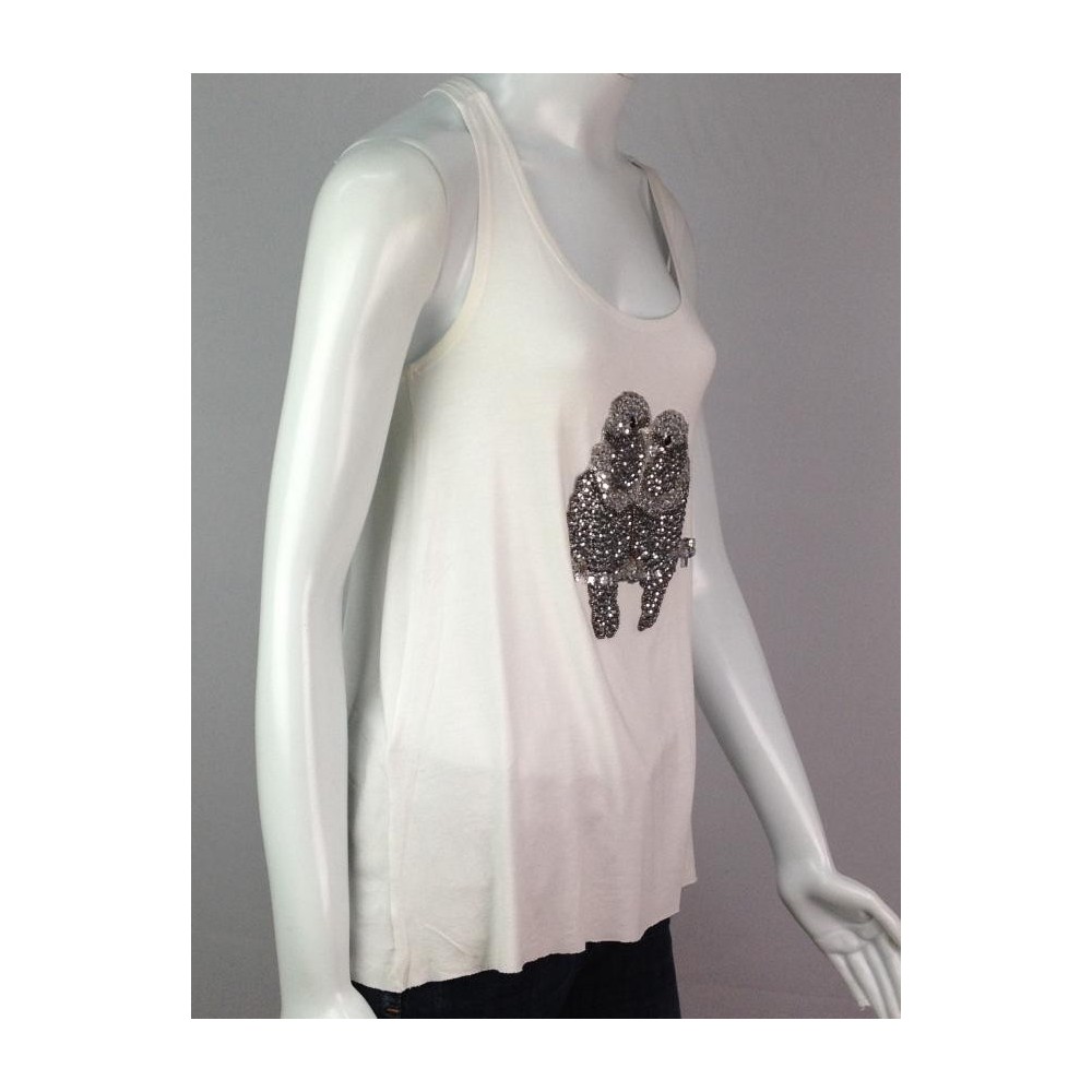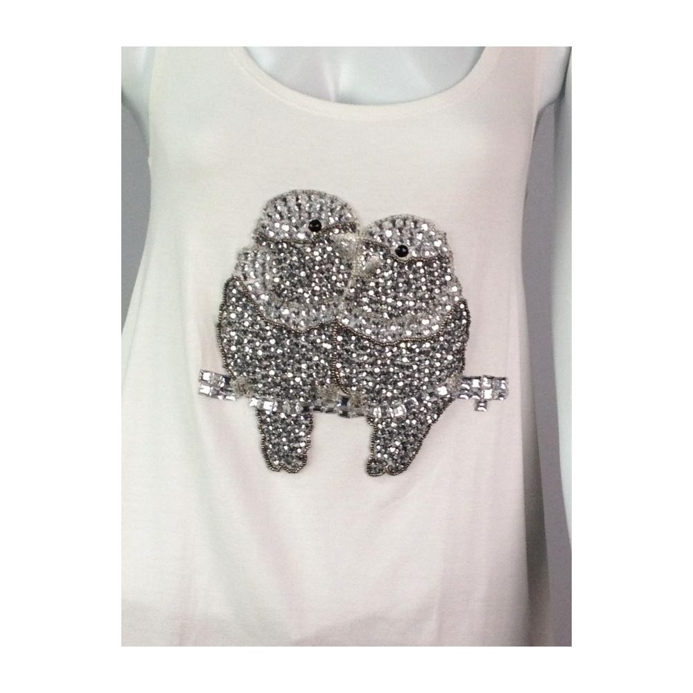 Regata com costas nadador. Detalhes em strass prata e preto formando um casal de passarinhos. Aparência perfeita.