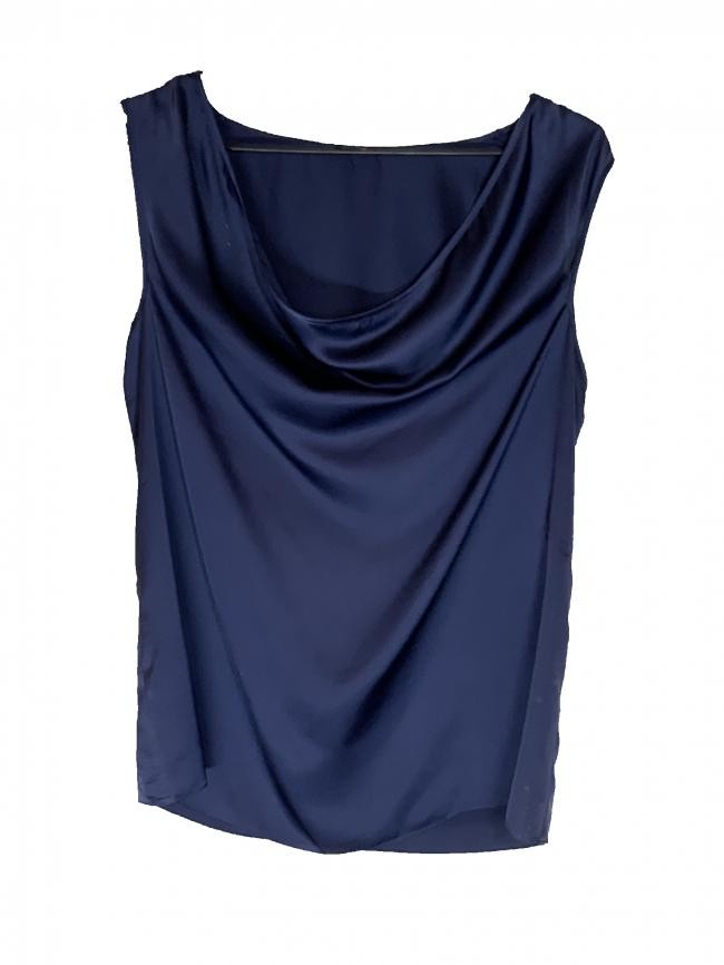 Drapeado na frente. O preço está baixo porque tem uma manchinha de guardado em uma das laterais.