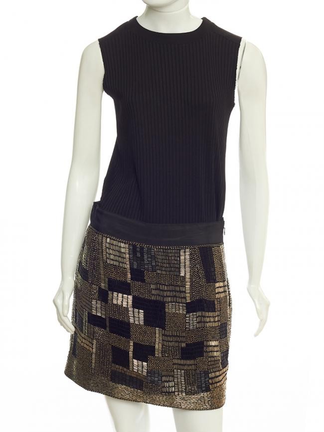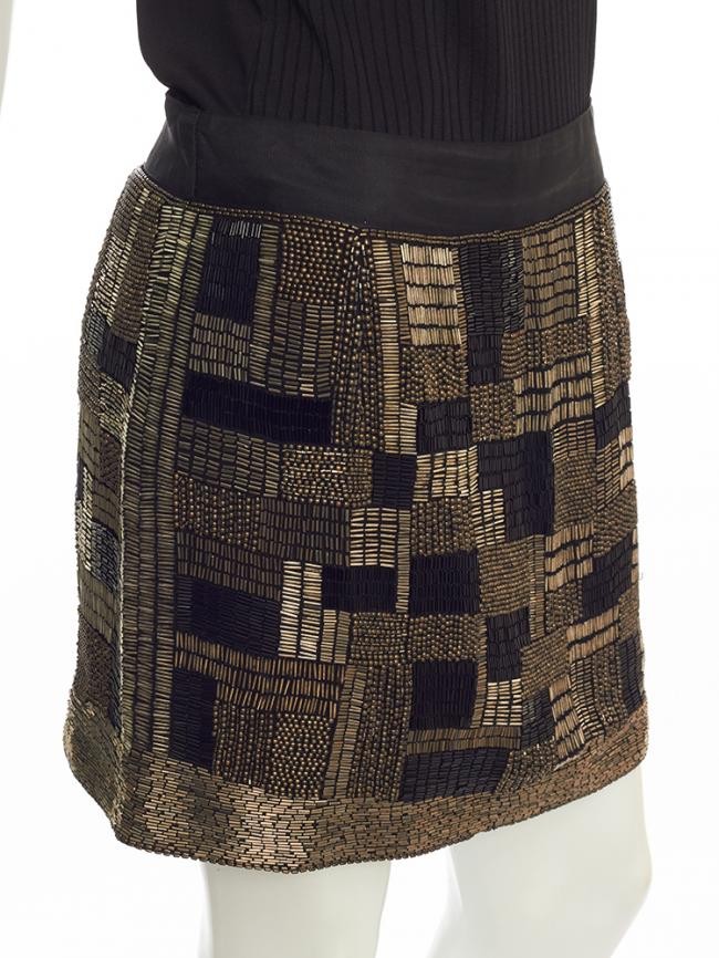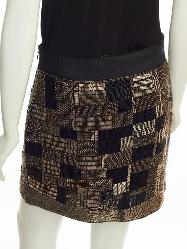 Confeccionada em 100% poliéster. Saia bordada com canutilhos nas cores : preto, prata, ouro velho e miçangas em ouro velho. Fechamento com zíper na lateral. Forrada. Na etiqueta tamanho M, veste 40 nacional. Medidas aproximadas : 44 cm comprimento e 80 cm cintura. APARÊNCIA DE NOVA.