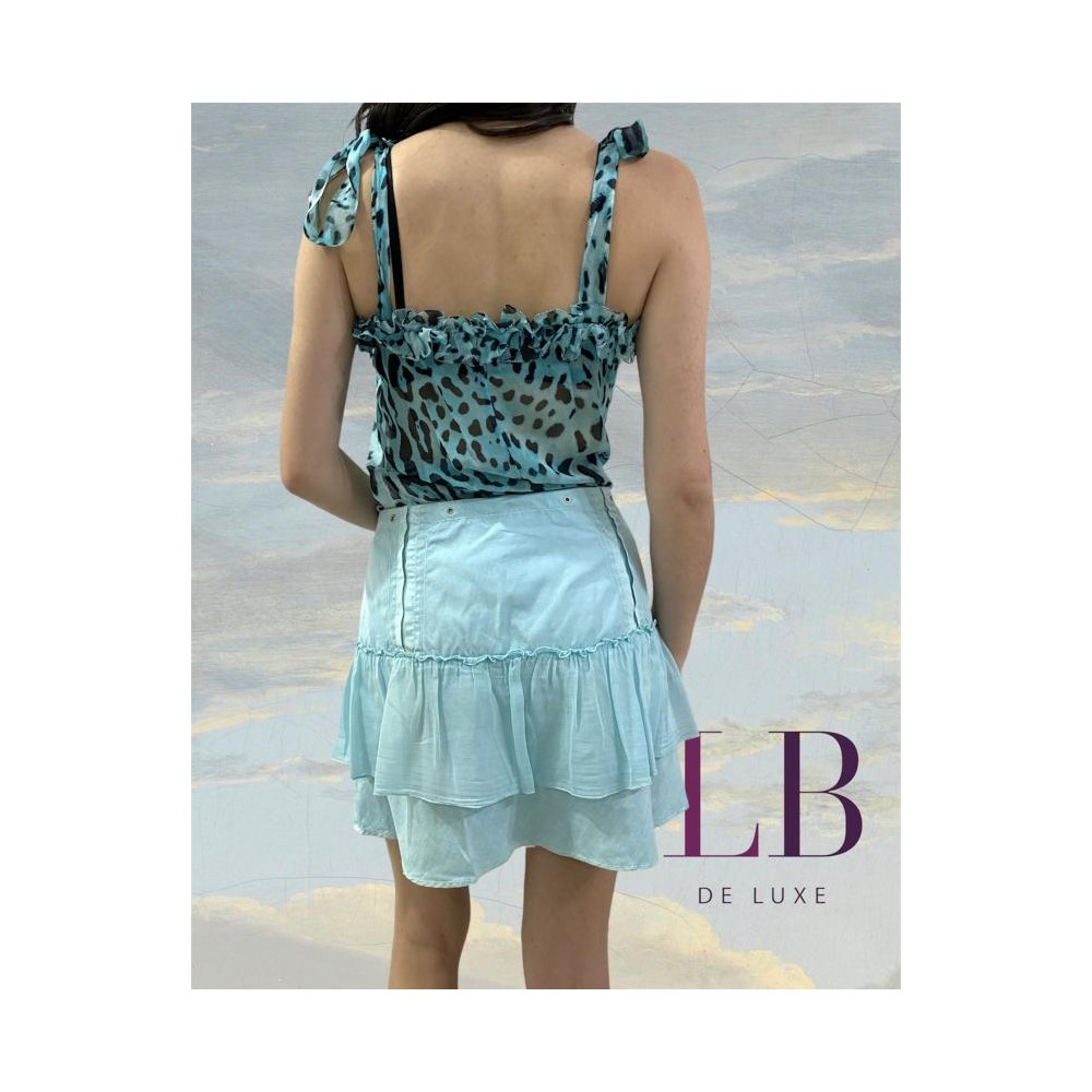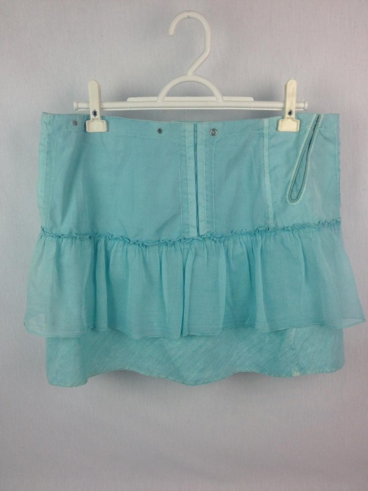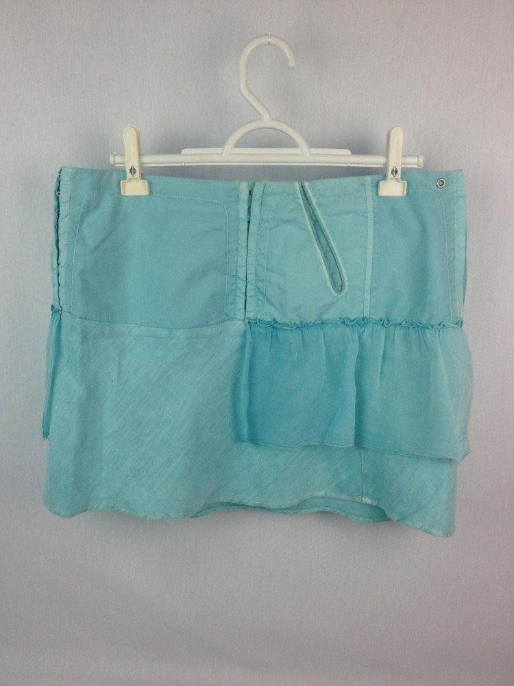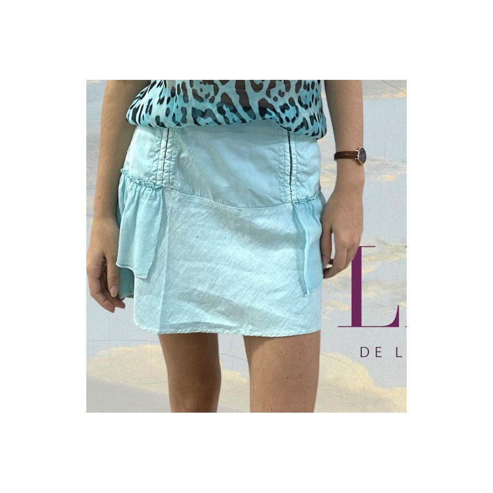 Saia Curta Armani Exchange azul, confeccionada em 100% algodão na parte de cima e 100% linho no corpo da saia. Assimétrica, dois bolsinhos com roloté. Colchetes para o abotoamento lateral com um babado transparente em cima do tecido de linho. Tamanho 10 na etiqueta, mas veste M no Brasil. RN# 91714. Medidas aproximadas: comprimento = 35/37 cm, cintura = 86 cm, quadril = 98 cm. IMPECÁVEL !