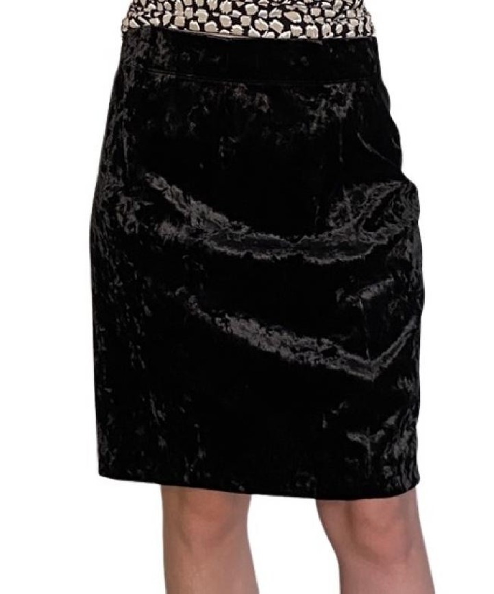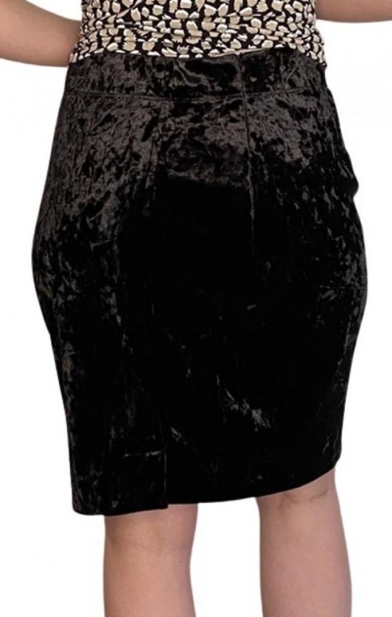 Confeccionada em tecido com aparência de veludo molhado, mas não tem etiqueta de composição. Elasticidade no cós, zíper lateral e botão interno. A modelo da foto tem 1,72 m de altura. Medidas aproximadas: comprimento = 51 cm mais 4 de bainha; cintura = 74 cm; quadril = 92 cm. Aparência perfeita.
