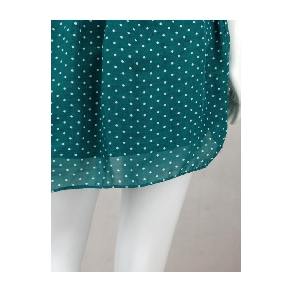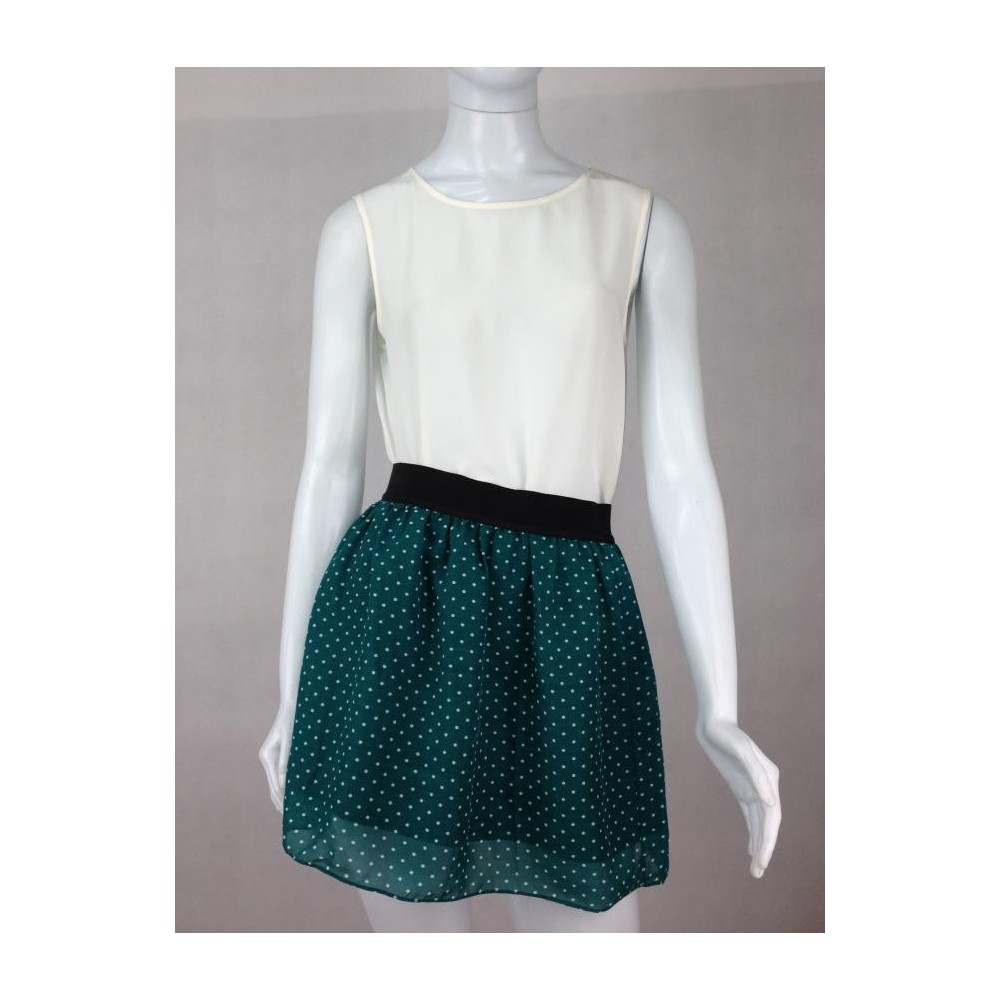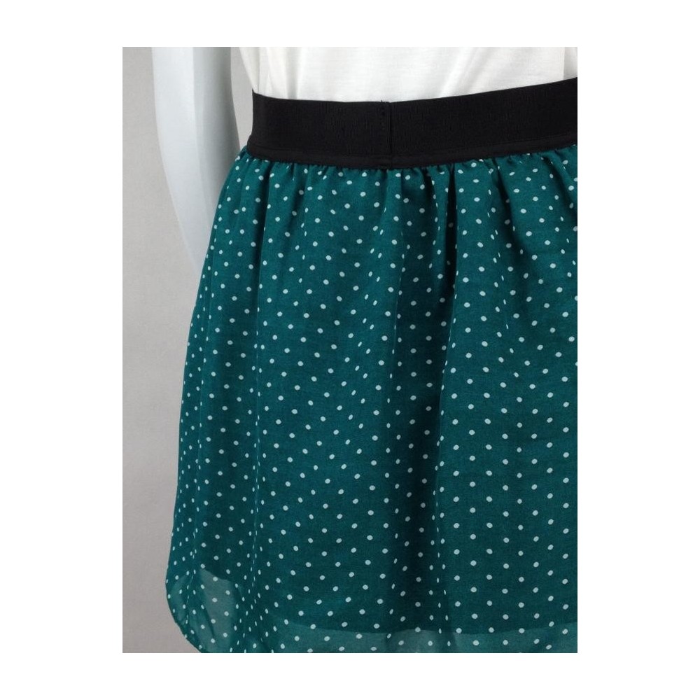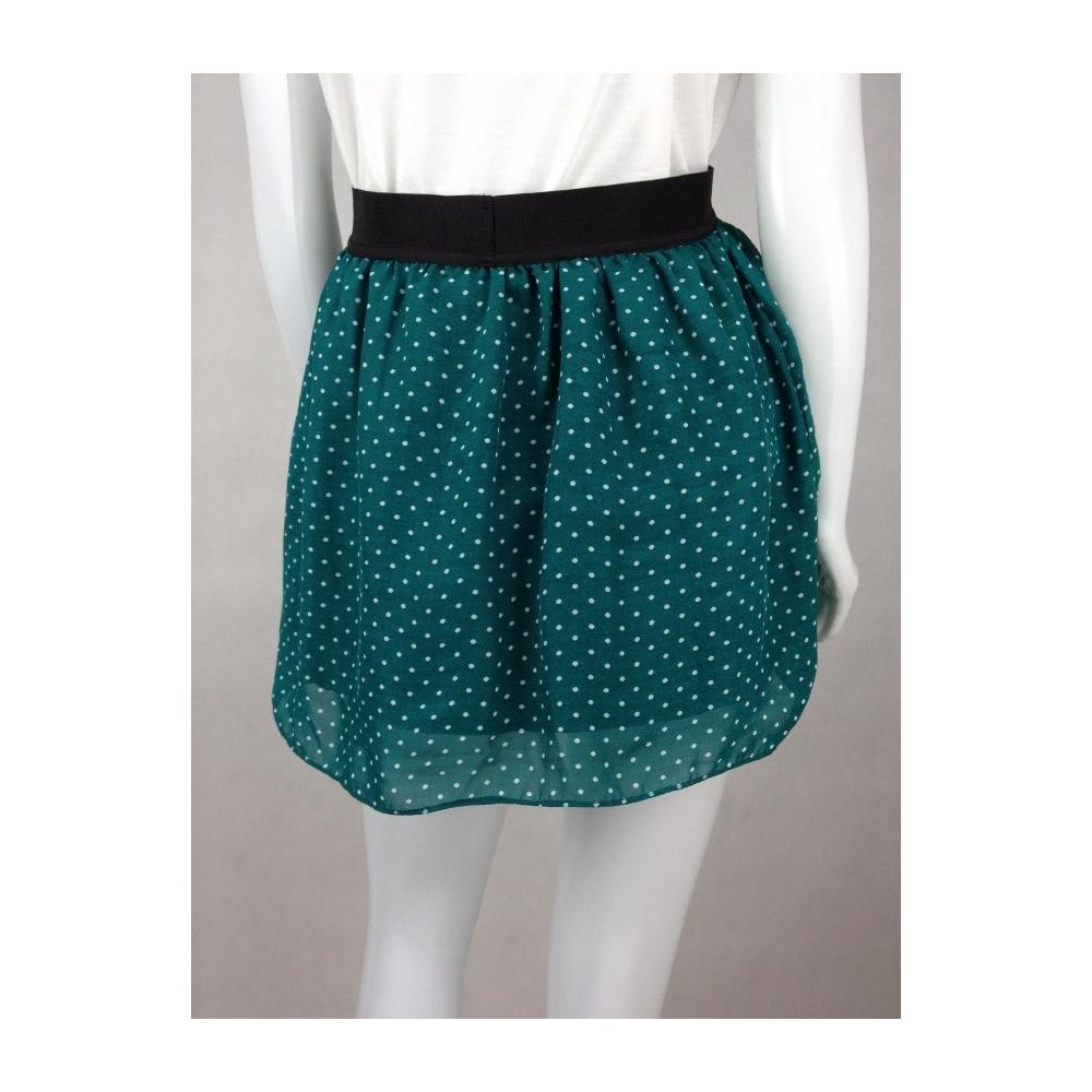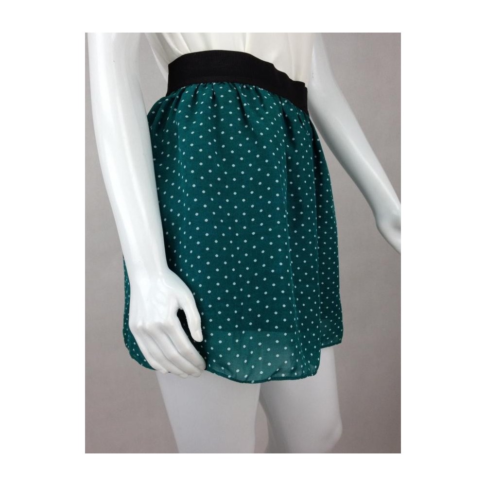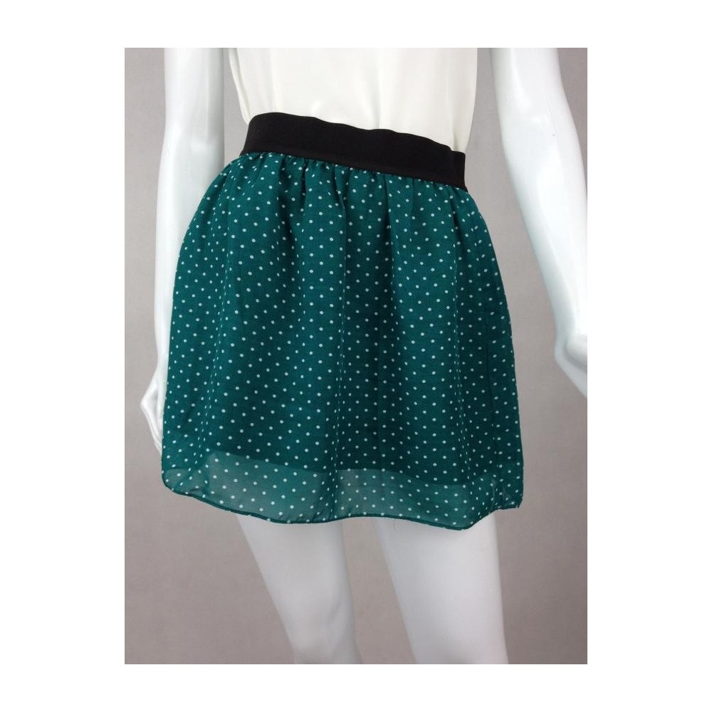 Confeccionada em 100% Poliéster. Verde de pois branca, com elástico preto na cintura. Forro menor que a saia deixando a barra levemente transparente. Aparência de nova.