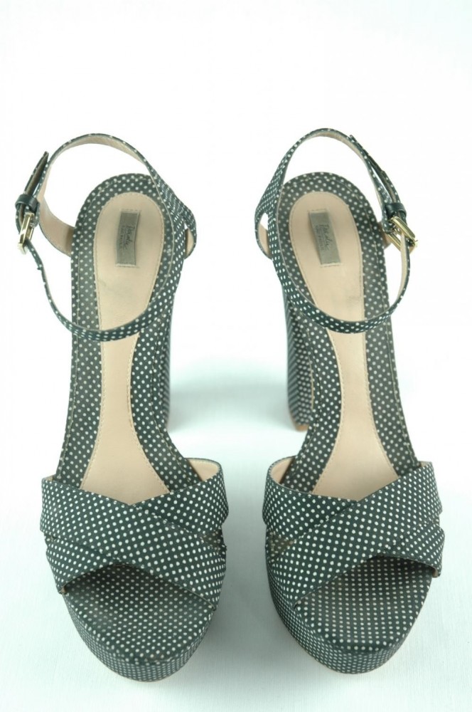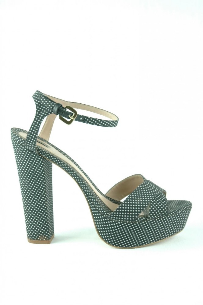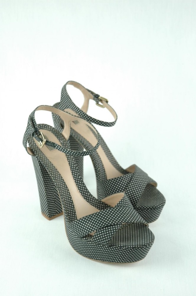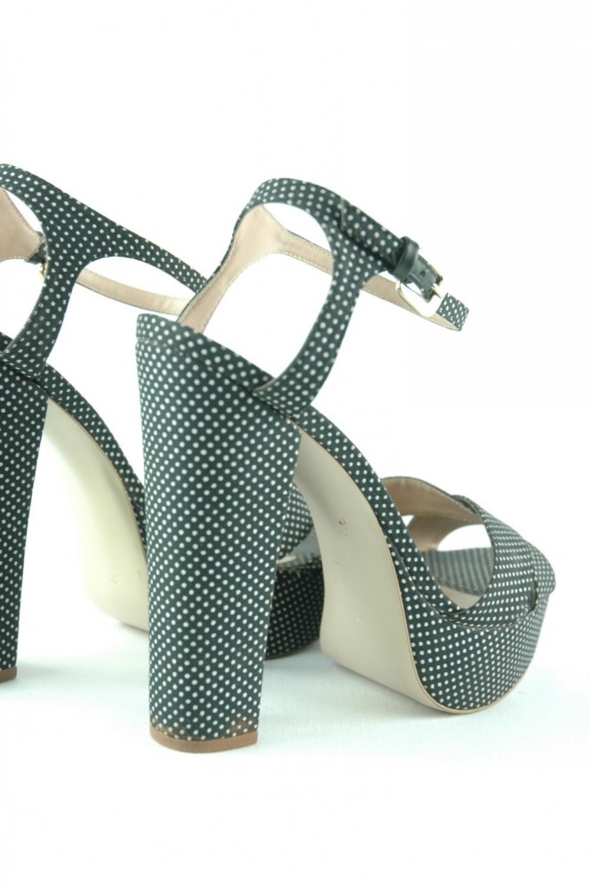 Sandália forrada de tecido preto e pois branco, com meia pata. Salto de 15 cm no mesmo tecido. Fivela dourada.