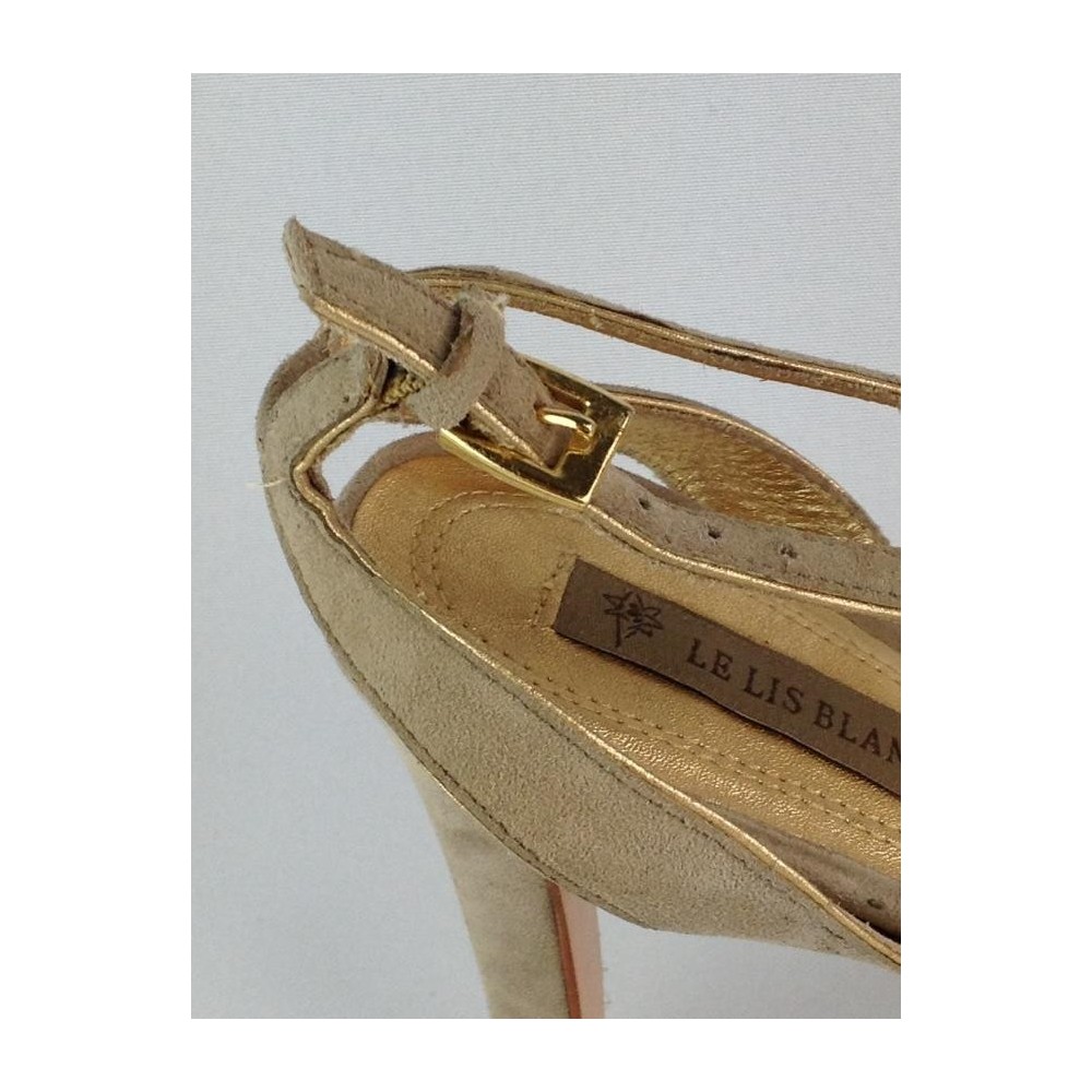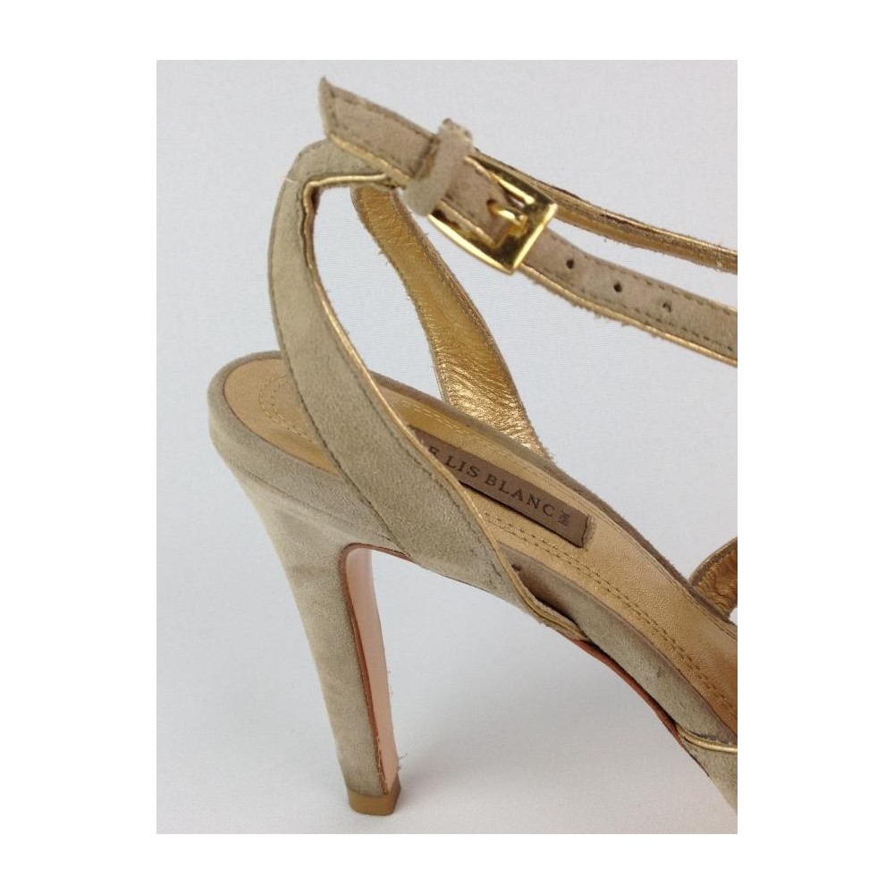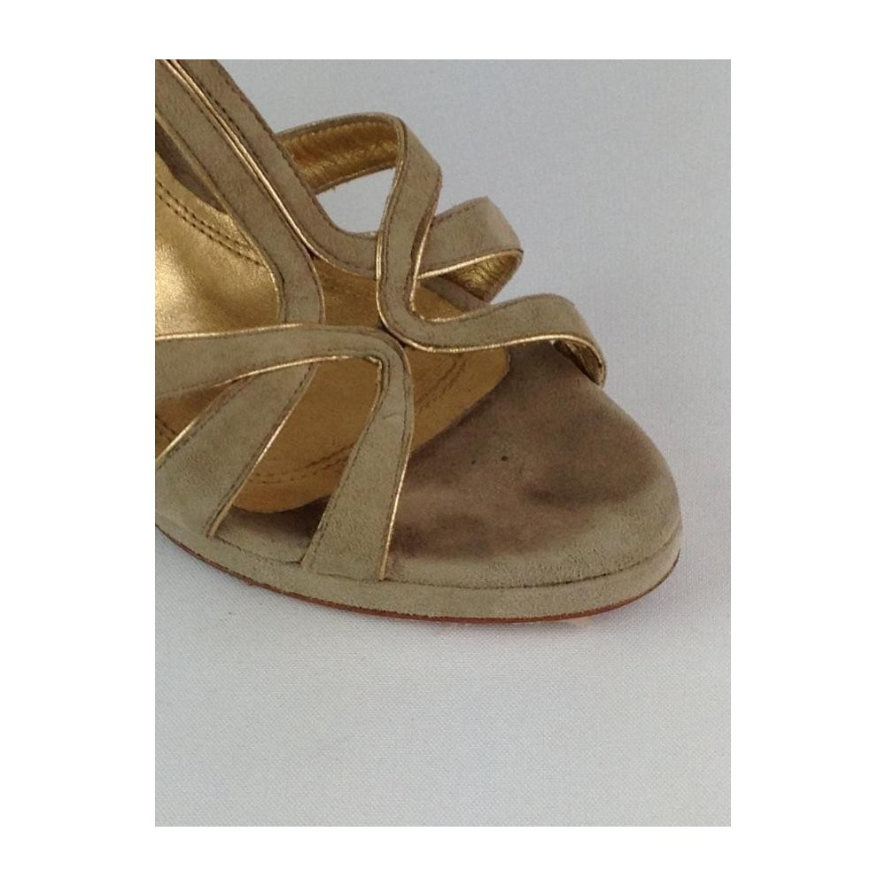 Camurça com uma fina tira de couro dourado, ferragens douradas, salto 10, pequenas marcas de uso que não comprometem o visual, quase imperceptíveis.