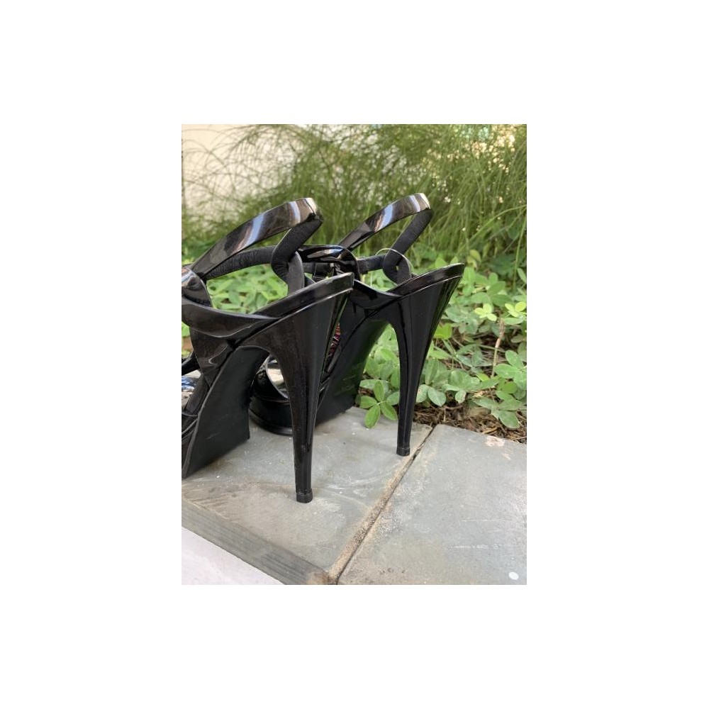 ORIGEM FRANÇA – Confeccionada em couro envernizado na cor preta. Salto fino de 13,5 cm, meia pata externa com 2,5 cm. Tiras entrelaçadas, fecha com fivela dourada com o nome da marca impresso. Preço na loja aproximadamente R$ 4.9000,00. Logo da marca na palmilha interna e na sola externa. Tamanho na sola, 37,5, mas calça 36,5 ou 37 no Brasil. A palmilha interna mede 24,5 cm. Apresenta sinais de uso na sola externa. De modo geral, a aparência está muito boa.