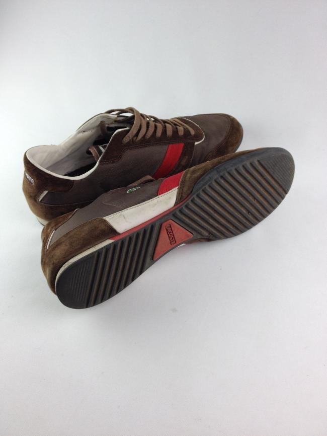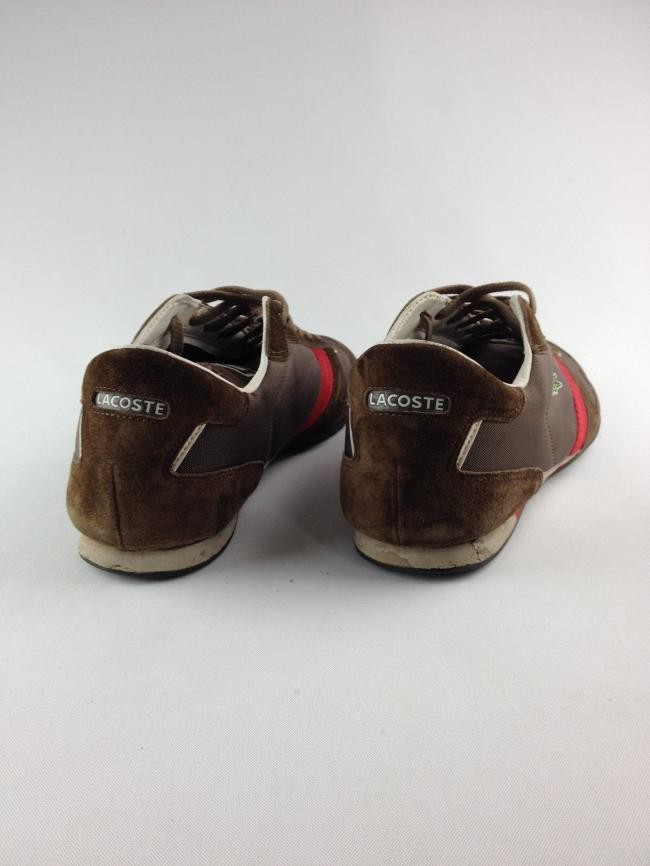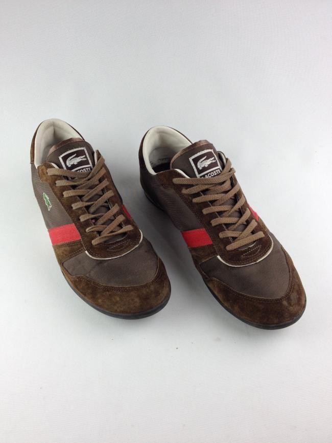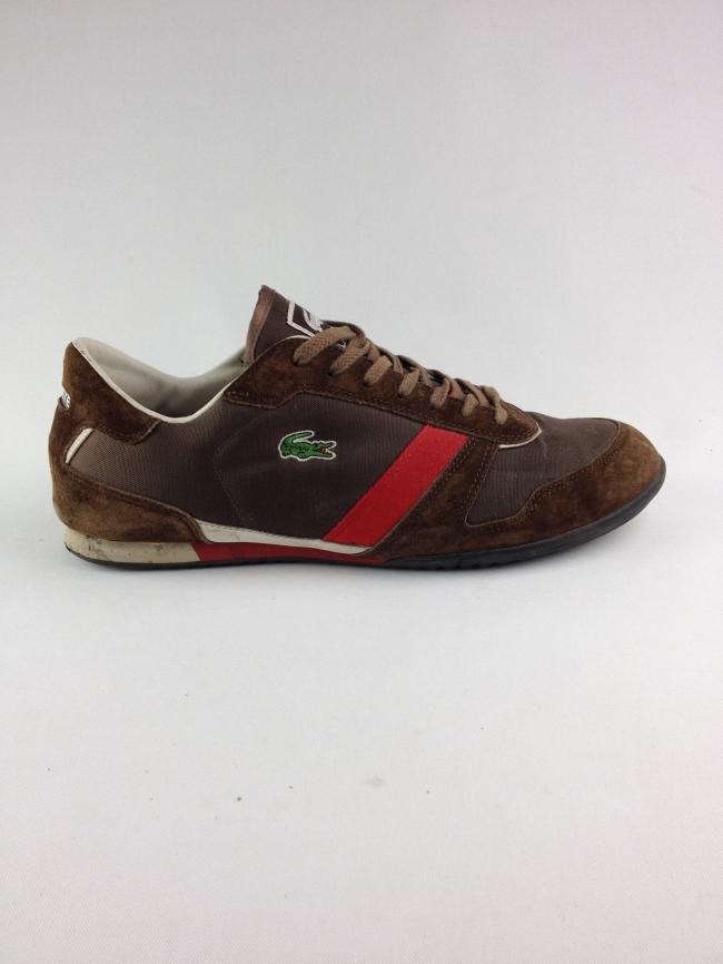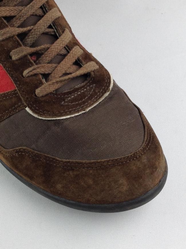 IMPORTADO DA FRANÇA – ORIGINAL, camurça marrom nas bordas, uma faixa de camurça marrom, couro branco, faixa vermelha, corpo de nylon. Tamanhos: Europa=44,5, EUA=11. Calça 42 nacional. Aparência muito boa, só com um desgaste na solinha lateral traseira (veja a foto). Solado embaixo perfeito com a marca em relevo vermelho.