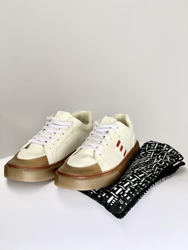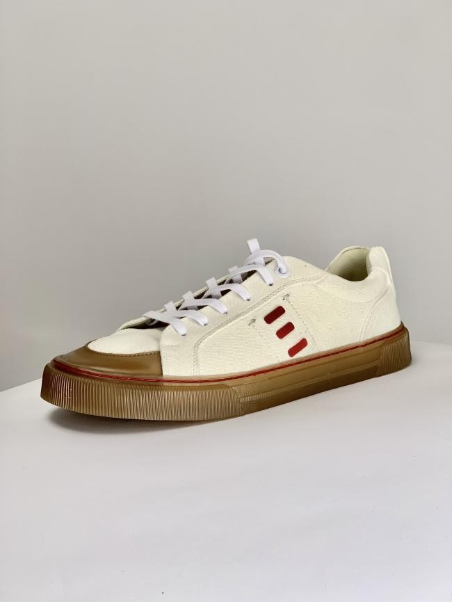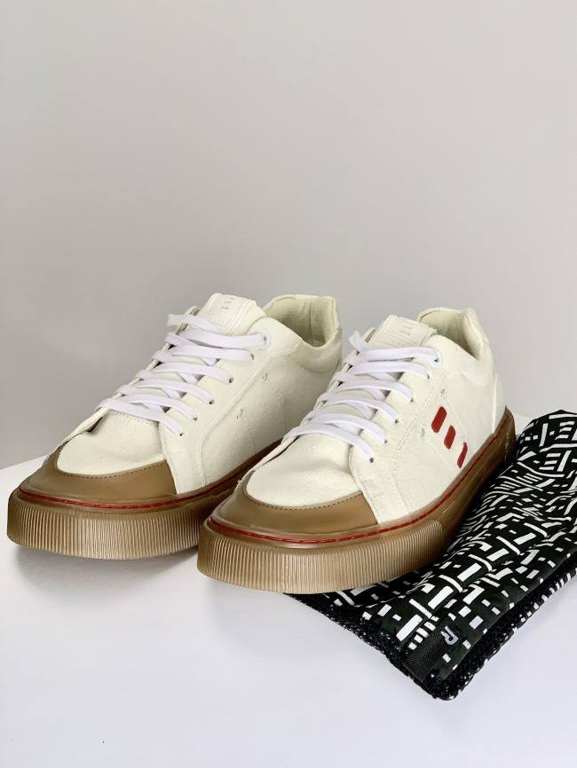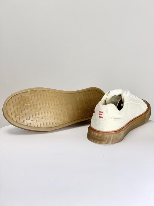 A cor é crua com detalhes em vermelho, solado antiderrapante caramelo, cadarço branco. Nome da marca na parte posterior. Acompanha um saquinho. NOVO.