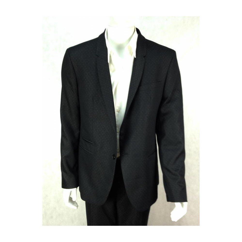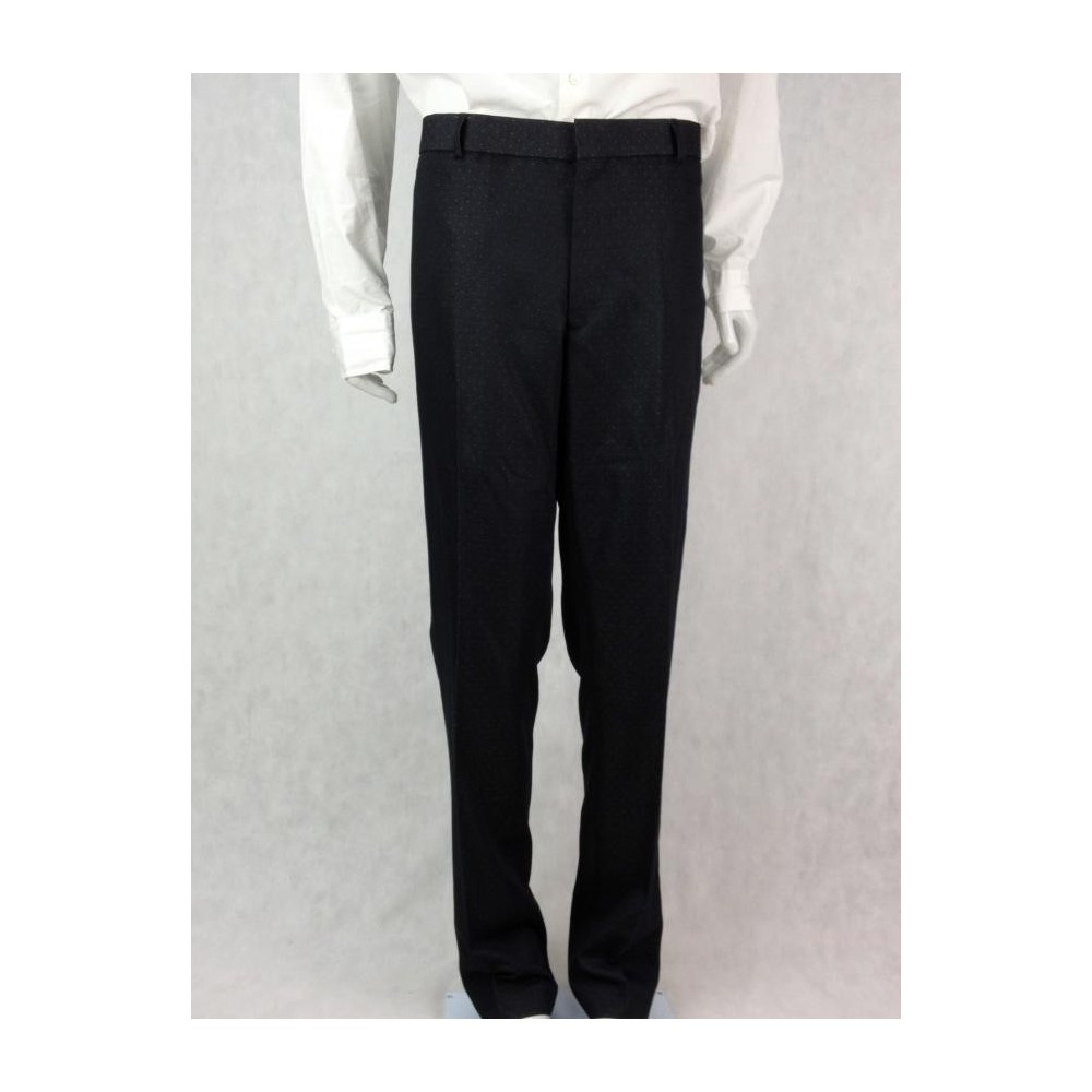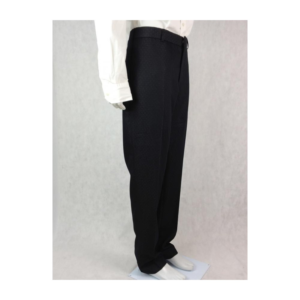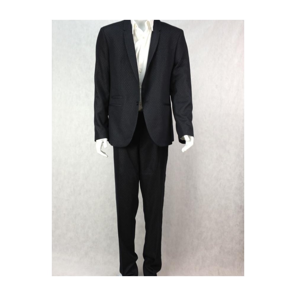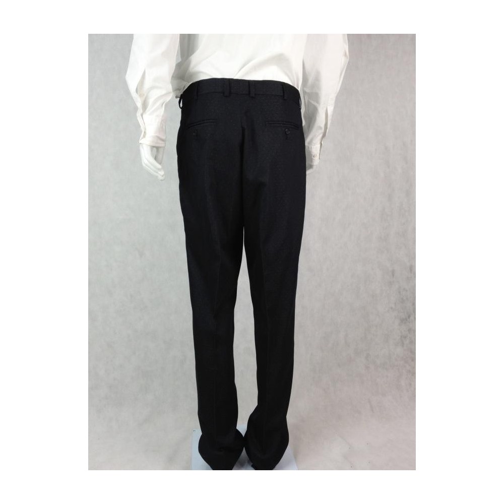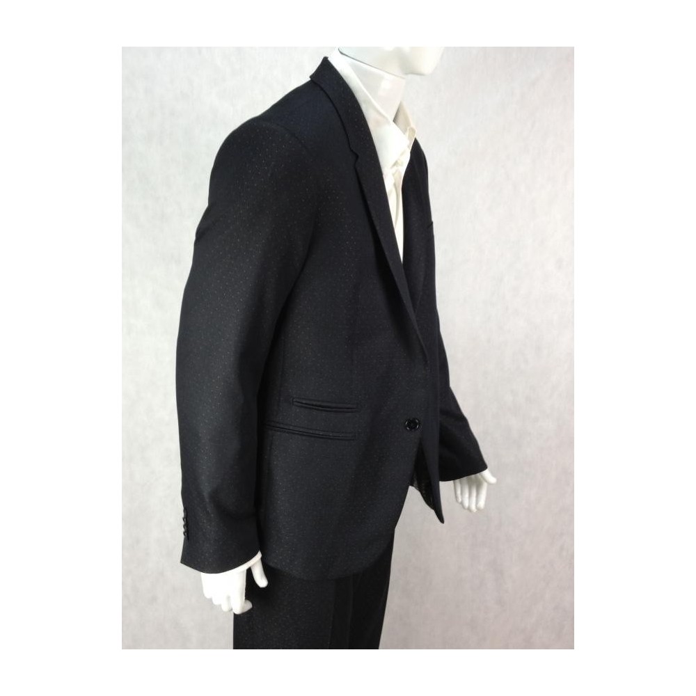 Raffer Trend British Design, uma das maiores indústrias de alfaiataria do país. Nunca foi usado. Forrado. Preto com discretas bolinhas brancas. Dois bolsos internos. Quatro bolsos externos costurados. Paletó tamanho 54, calça tamanho 46. Medidas aproximadas: comprimento = 108 cm; ombro = 46 cm; busto = 108 cm; cintura = 104 cm. CALÇA: comprimento = 110 cm mais 3,5 de bainha; cintura = 88 cm; cavalo = 26 cm; quadril = 100 cm.
