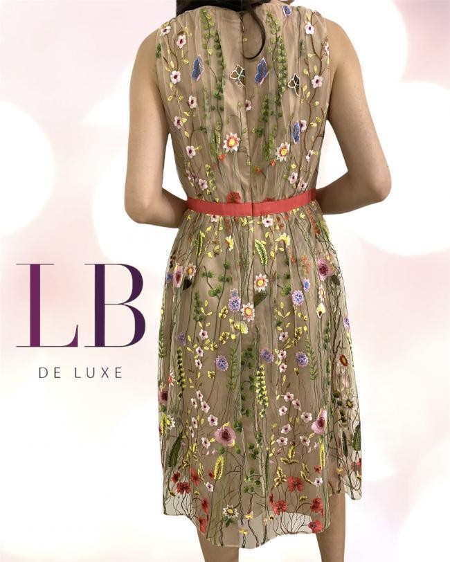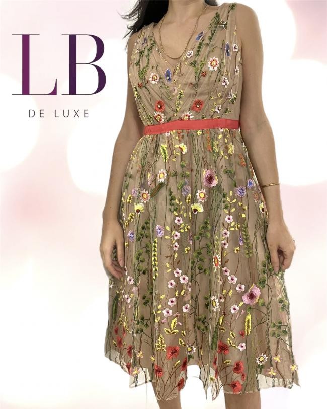 ORIGEM USA – Confeccionado em 100% poliéster. Florido. Forro nude com a tule toda bordada. Cristais como miolo das flores na parte de cima. Zíper invisível atrás. Na cintura, tem uma fita de gorgurão. RN # 59782. Tamanhos US/CAN=8, EU=40, UK=12. Impecável.