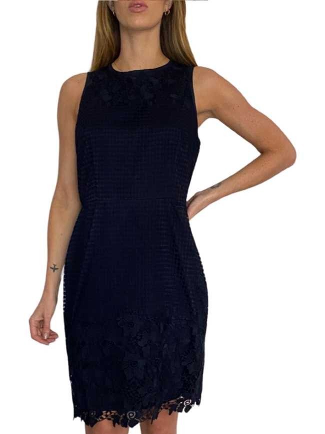 Confeccionado em tecido com dois tipos de bordado. Forro azul que é feito de tela com 94% poliéster e 6% elastano. Veste M ou P, conforme as medidas aproximadas: comprimento = 94 cm; busto = 88 cm; cintura = 80 cm; quadril = 98 cm. Tem uma tela com bordados no exterior feita em 100% poliéster. Tamanho 10P na etiqueta interna. Busto e barra com bordados de flor Obs: a modelo da foto tem 1,72 m. Aparência perfeita.