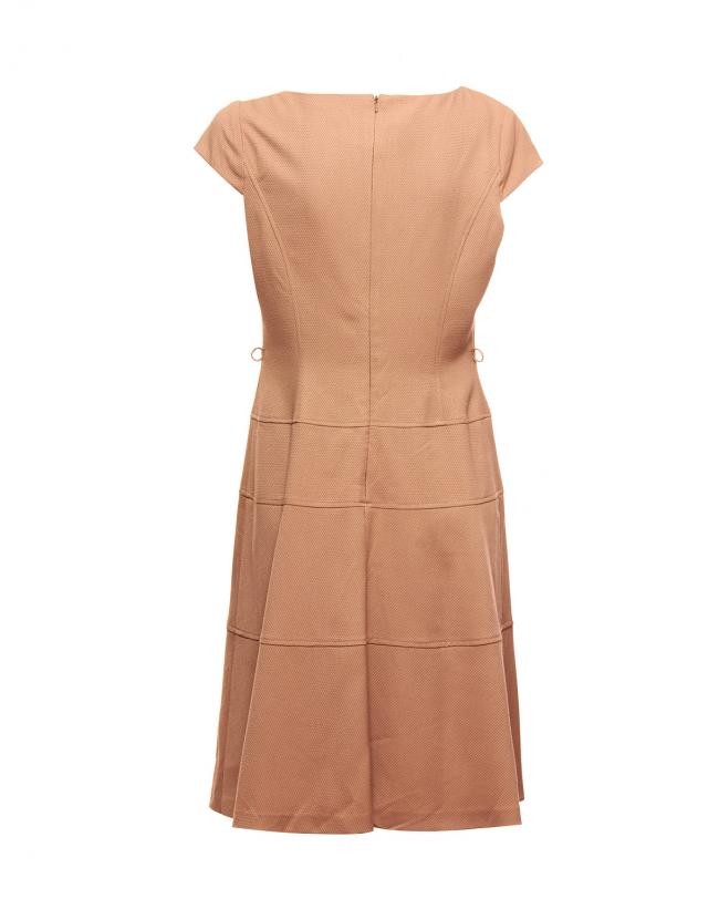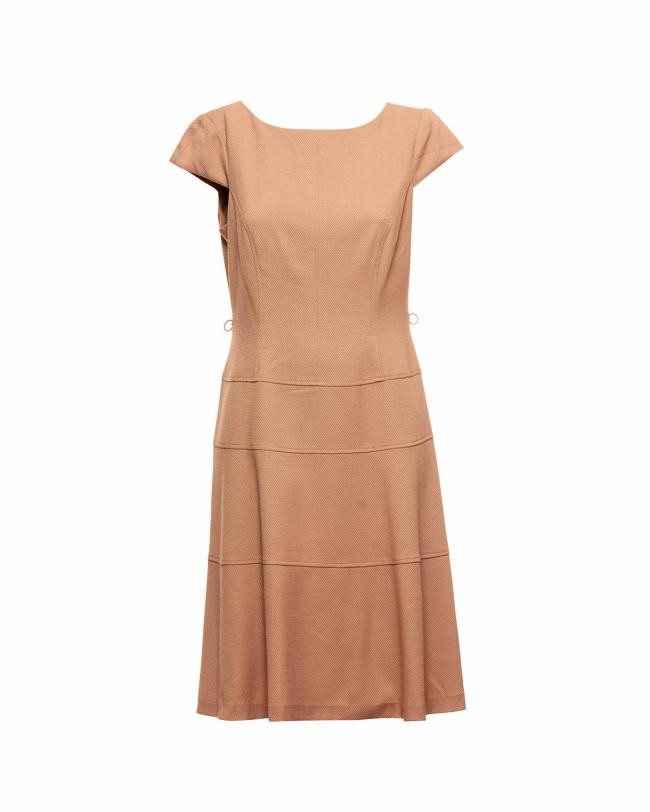 Confeccionado em 67% poliéster,m 1% elastano e 32% rayon. Recortes como detalhes. O vestido vai ficando evasé a partir da cintura. RN 54050. Forrado na parte do busto até a cintura. Zíper atrás, Dois passantes de linho caso queira usar um cinto. Aparência ótima, tamanho 10 na etiqueta, mas confira as medidas: comprimento = 101 cm mais 3 de bainha, busto = 90 cm, cintura = 88 cm, quadril = 104 cm. Cor: Bege queimado.