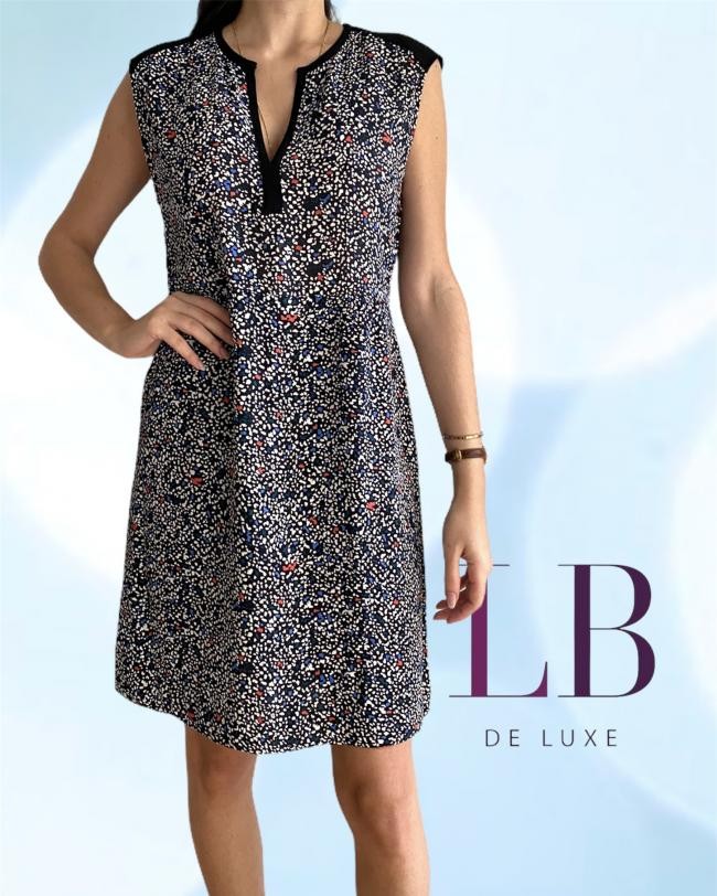 ORIGEM ESPANHA – Sem etiqueta de composição, mas parece ser seda. Fundo preto estampado com tons de azul, vermelho e off-white. Tamanho M na etiqueta. Forro preto preso somente na saia (abaixo da cintura). Zíper invisível atrás. Impecável. Medidas aproximadas: comprimento = 92 cm mais 4 de bainha, busto = 90 cm, cintura = 80 cm, quadril = 100 cm.