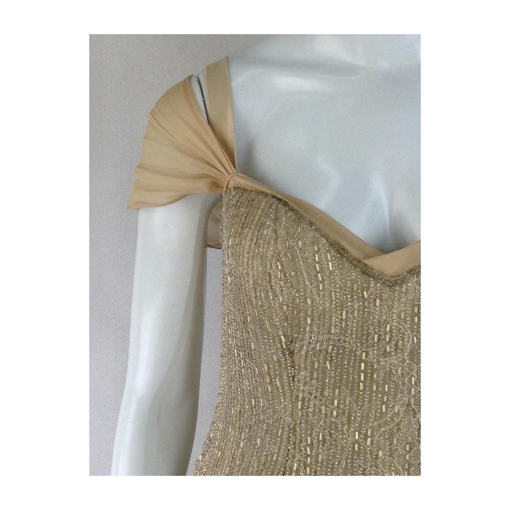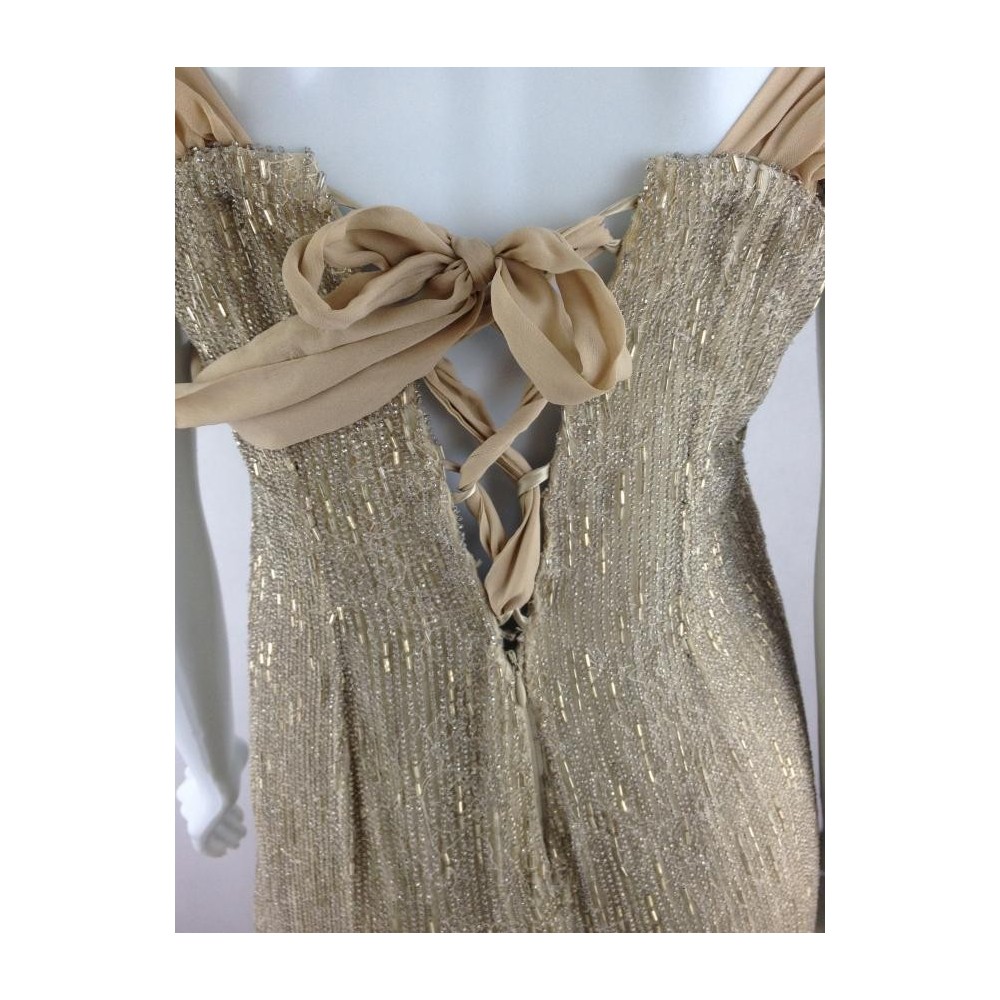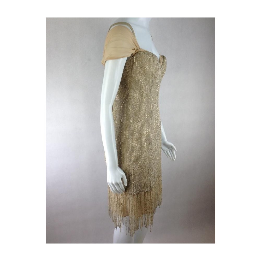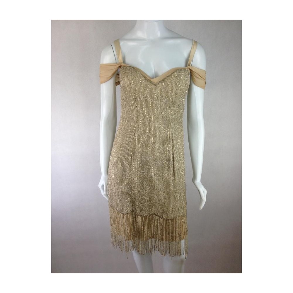 Daslu Couture, leia-se Sandra Barros. Crepe de seda bordado com canutilhos nude. Forrado. Busto estruturado com bojo, alças de crepe de seda que se entrelaçam atrás. Veste de 38 até 42, pois tem laços atrás ajustáveis. Franjas de canutilhos, fechamento com zíper nas costas. Aparência perfeita. Medidas aproximadas: busto = 88 cm, cintura = 76 cm, quadril = 86 cm.