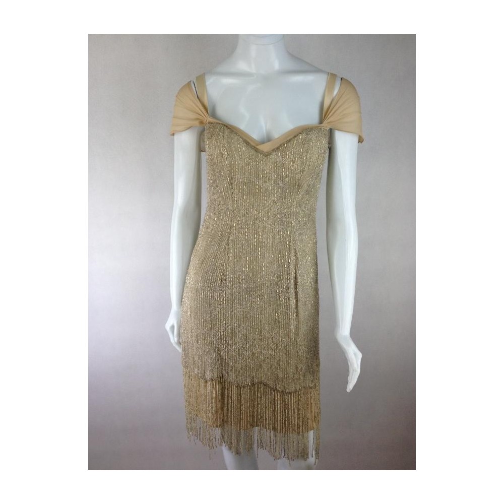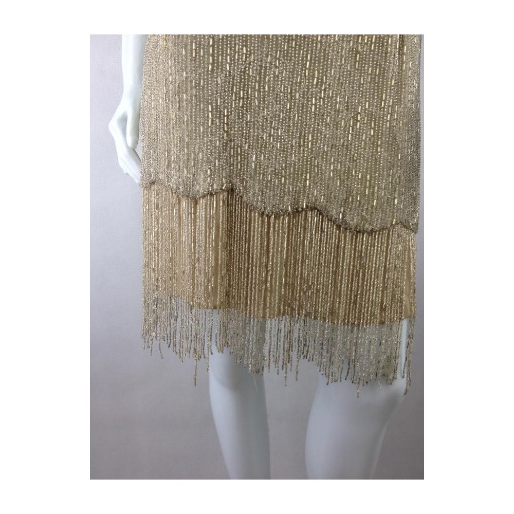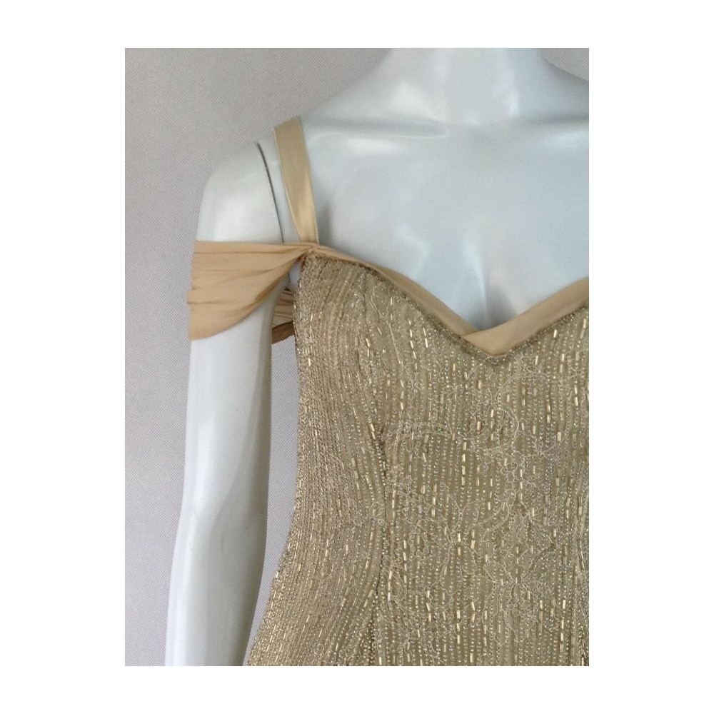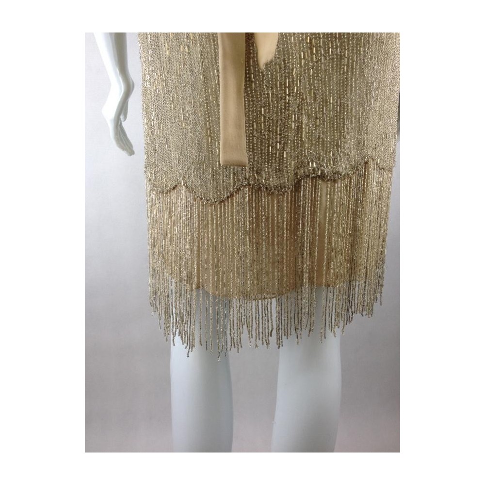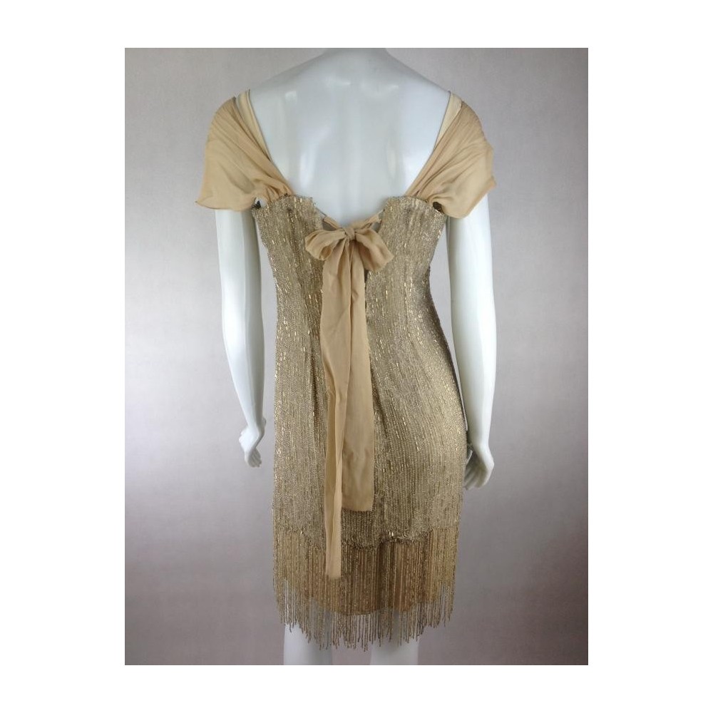 Daslu Couture, leia-se Sandra Barros. Crepe de seda bordado com canutilhos nude. Forrado. Busto estruturado com bojo, alças de crepe de seda que se entrelaçam atrás. Veste de 38 até 42, pois tem laços atrás ajustáveis. Franjas de canutilhos, fechamento com zíper nas costas. Aparência perfeita. Medidas aproximadas: busto = 88 cm, cintura = 76 cm, quadril = 86 cm.