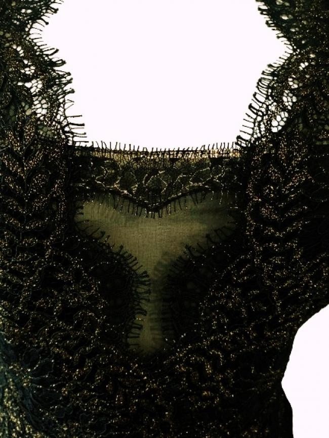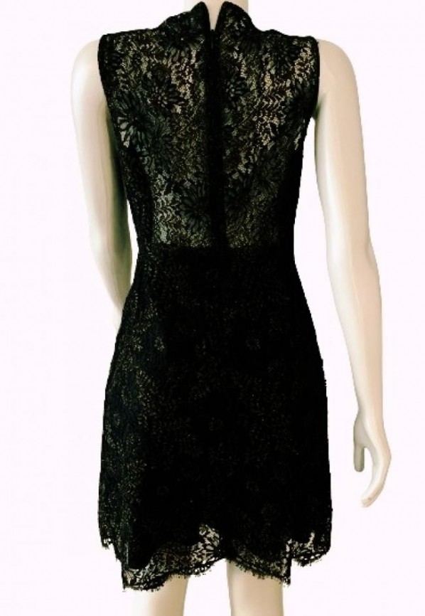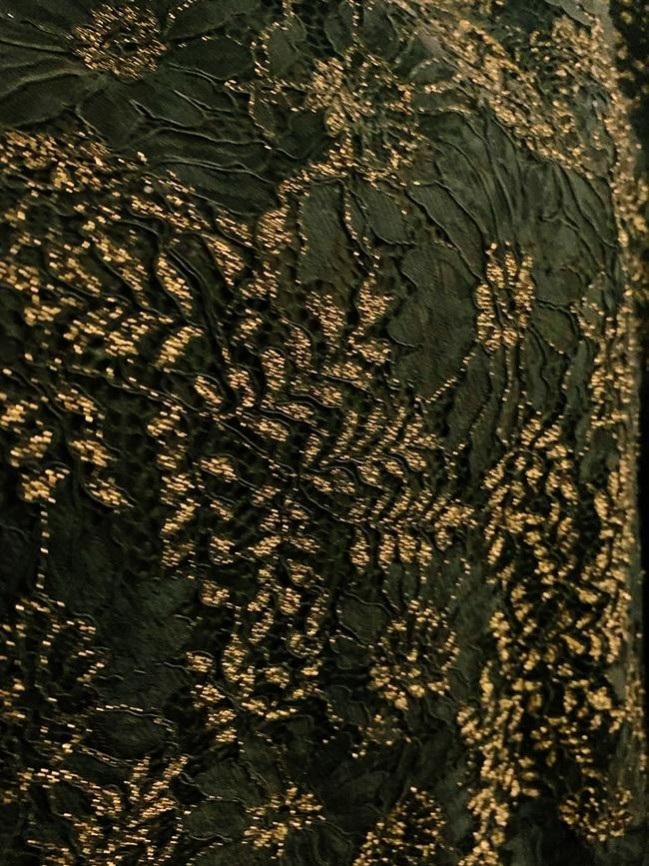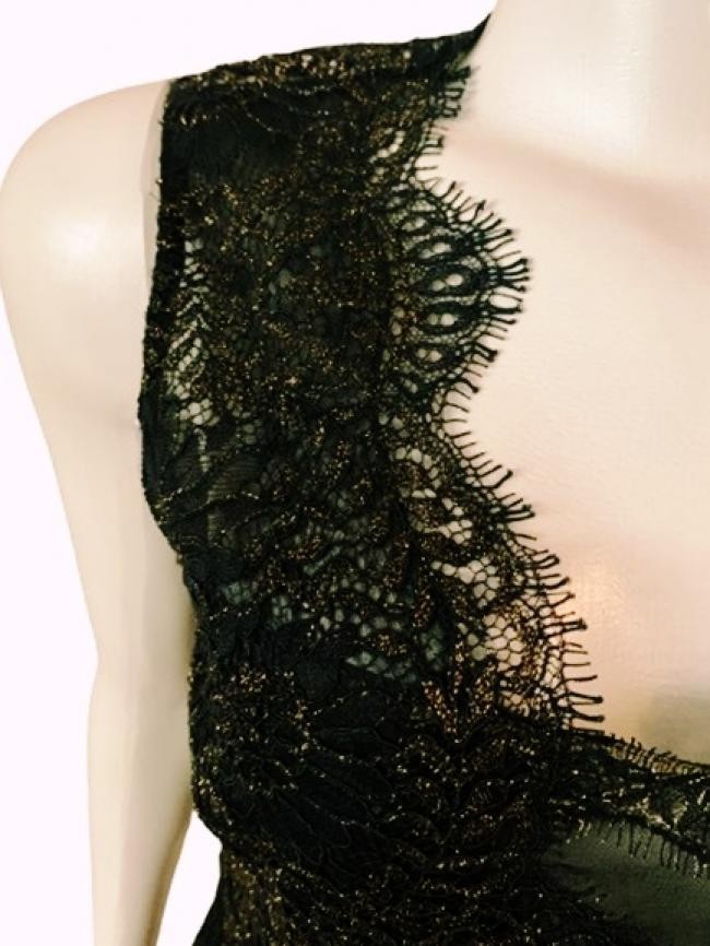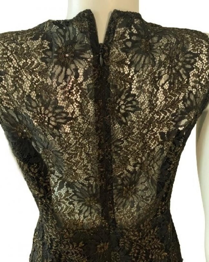 ORIGEM EUA – Confeccionado em tecido 100% seda com renda e bordados com fios dourados e pretos, forrado em tecido em 88% poliéster e 12% elastano, mas com transparência na parte superior das costas. Detalhe transparente também no decote, zíper atrás. Flores e folhas bordadas com fios pretos e metálicos dourados. Impecável !
