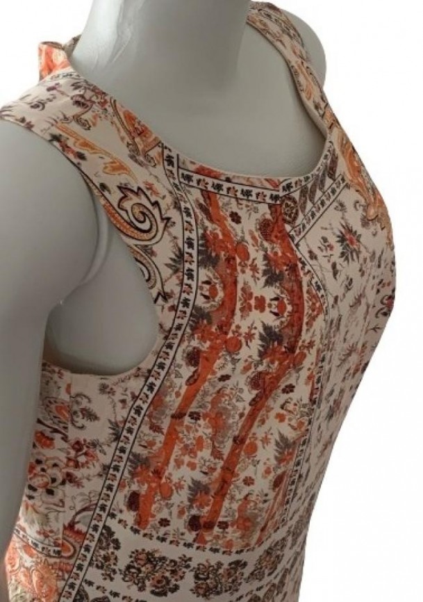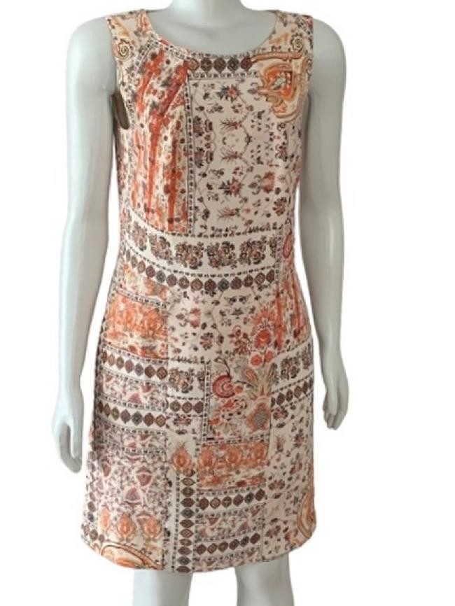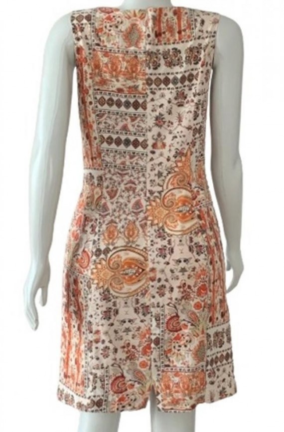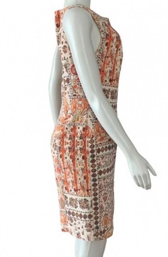 Confeccionado em 93% seda e 7% elastano, forrado, zíper atrás. Estampado em tons de laranja, terrosos, off-white e um pouco de azul. Tamanho 42 na etiqueta, mas confira as medidas aproximadas: comprimento = 90 cm mais 4 de bainha; busto = 88 cm; cintura = 80 cm; quadril = 90 cm. Aparência ótima. Preço na loja, aprox. R$ 1.300,00.